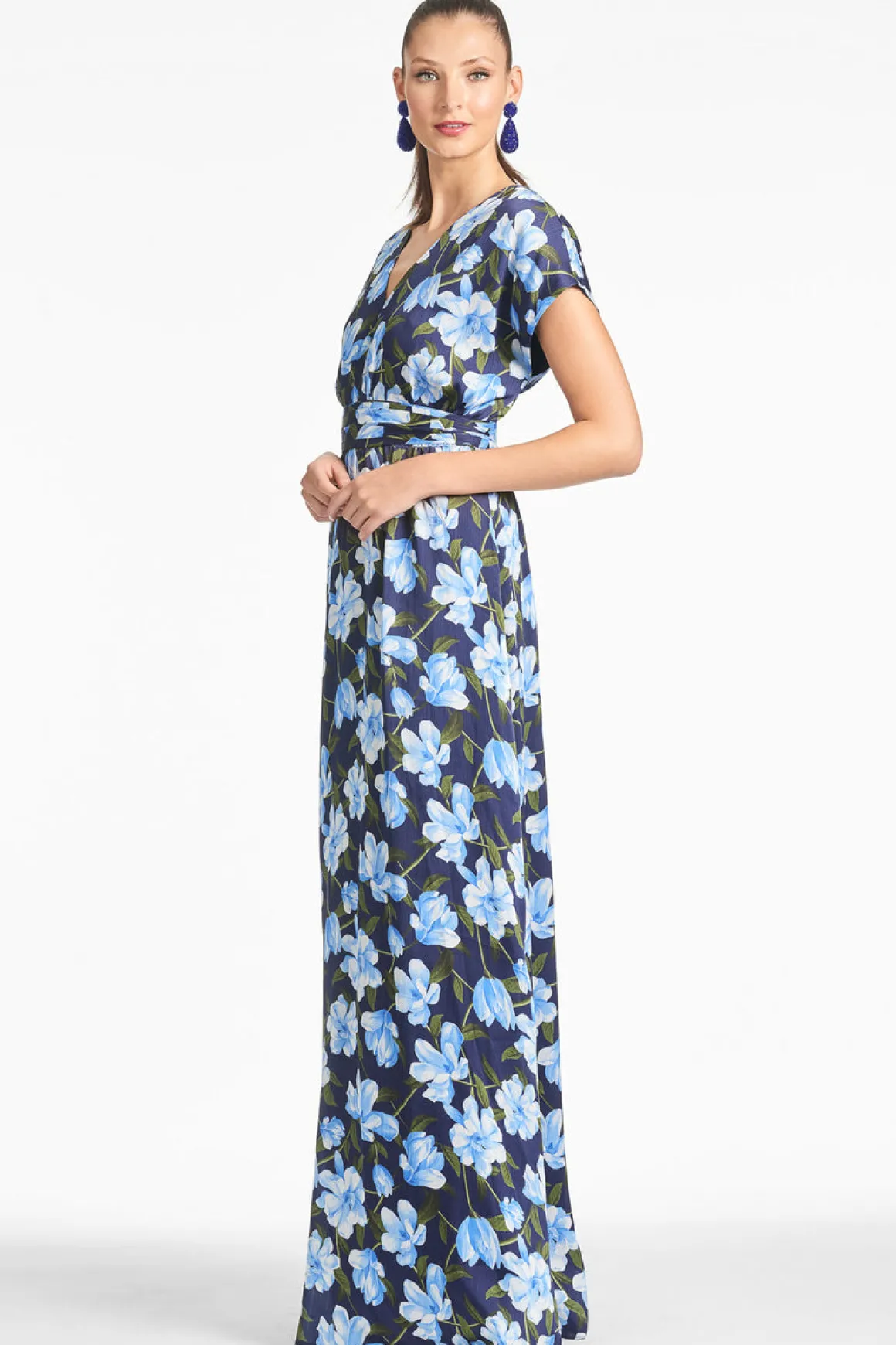 The Leah Gown is a vision in floral. This printed chiffon maxi features a center slit, a V-neck cut, and flutter sleeves for the most flattering fit. The cobalt and navy petal print make her the Spring and Summer dream dress.