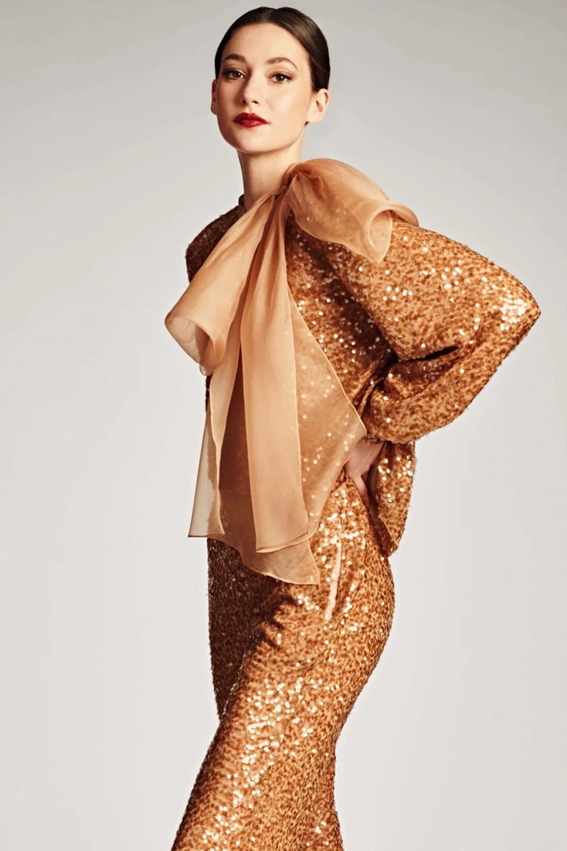 This long sleeve top is crafted with shimmery sequins for a sparkle and shine you will love with an oversized organza bow on the shoulder. The perfect party-ready piece, it’s a must-have addition to your wardrobe for any special occasion. With a coordinating set of bottoms, you’ll sparkle in this unique set.