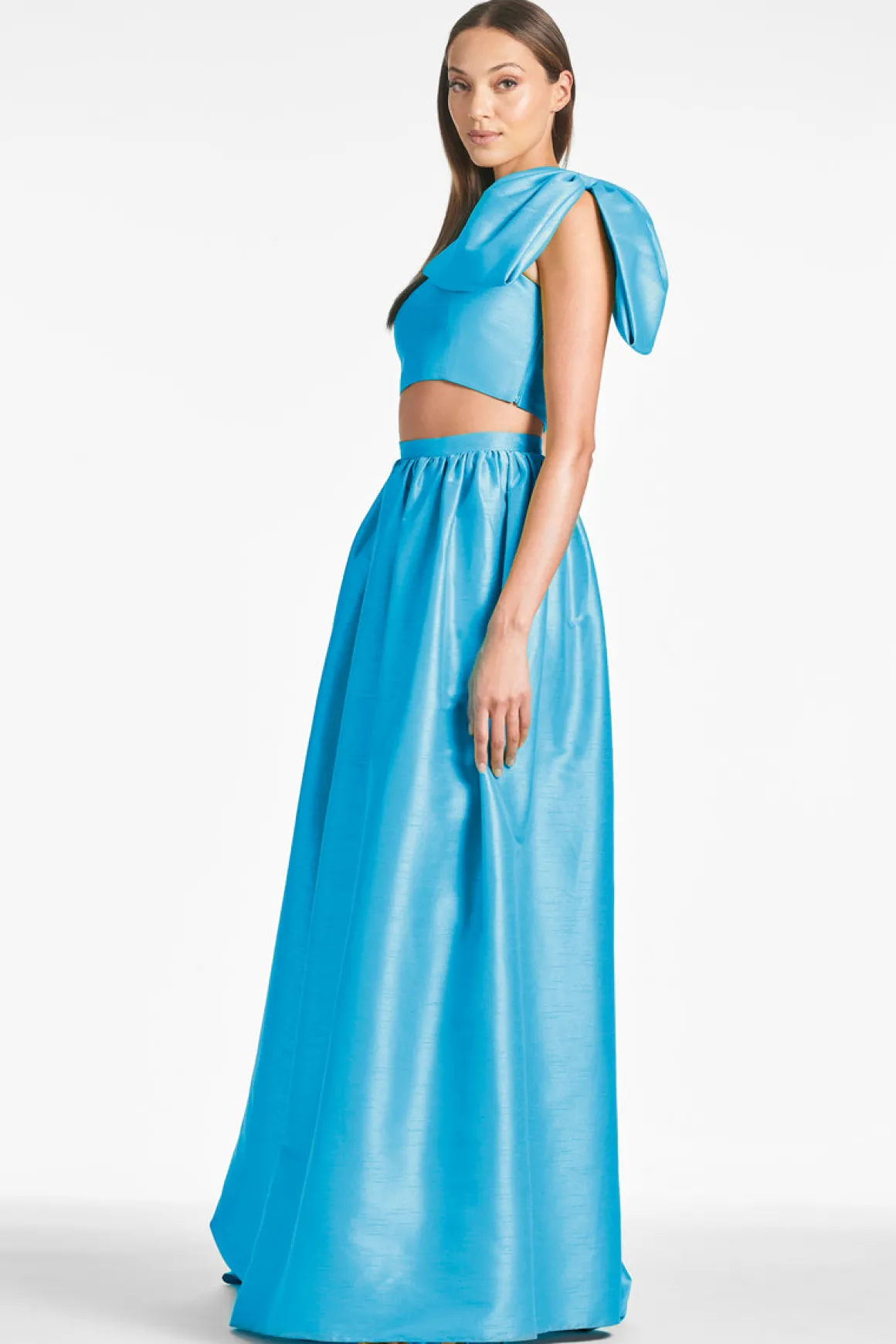 Sydney is the event maxi skirt you’ve been waiting for. She cinches at the waist and drapes beautifully to form an elegant, classic silhouette. Made of luxurious dupioni fabric, this piece is a wardrobe staple. Pair her back to its matching crop top or the white Astor blouse for a more daytime-friendly look.