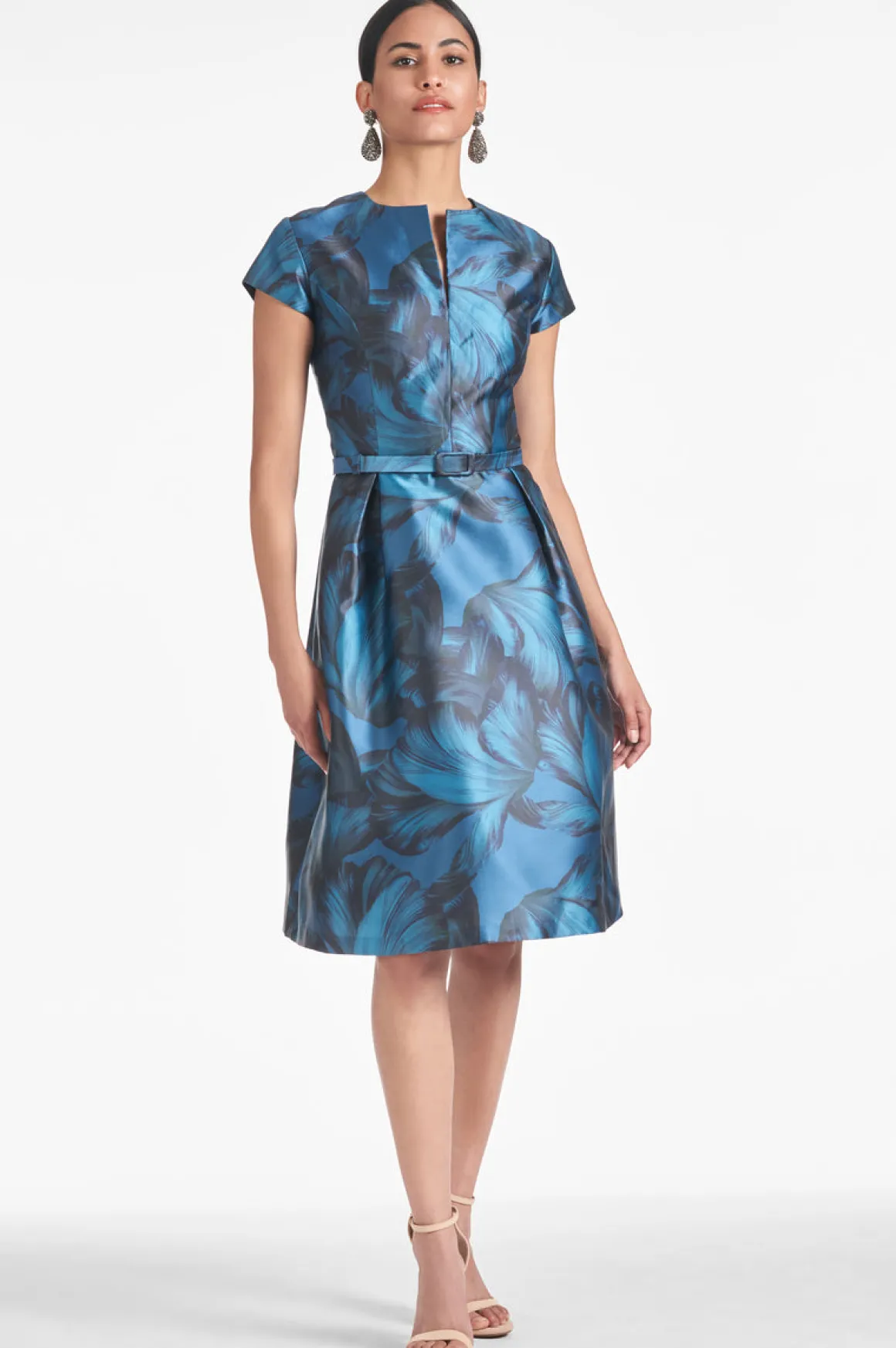 The Maddox Dress is a stylish new look with timeless appeal. Crafted with printed mikado fabric, this tea length dress features a tonal petal print for a classy touch. Perfect for special occasions.