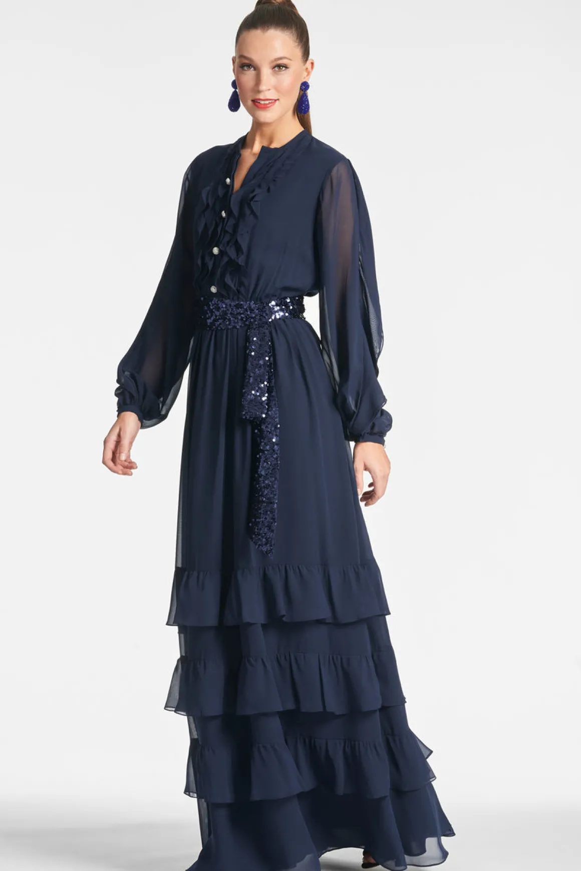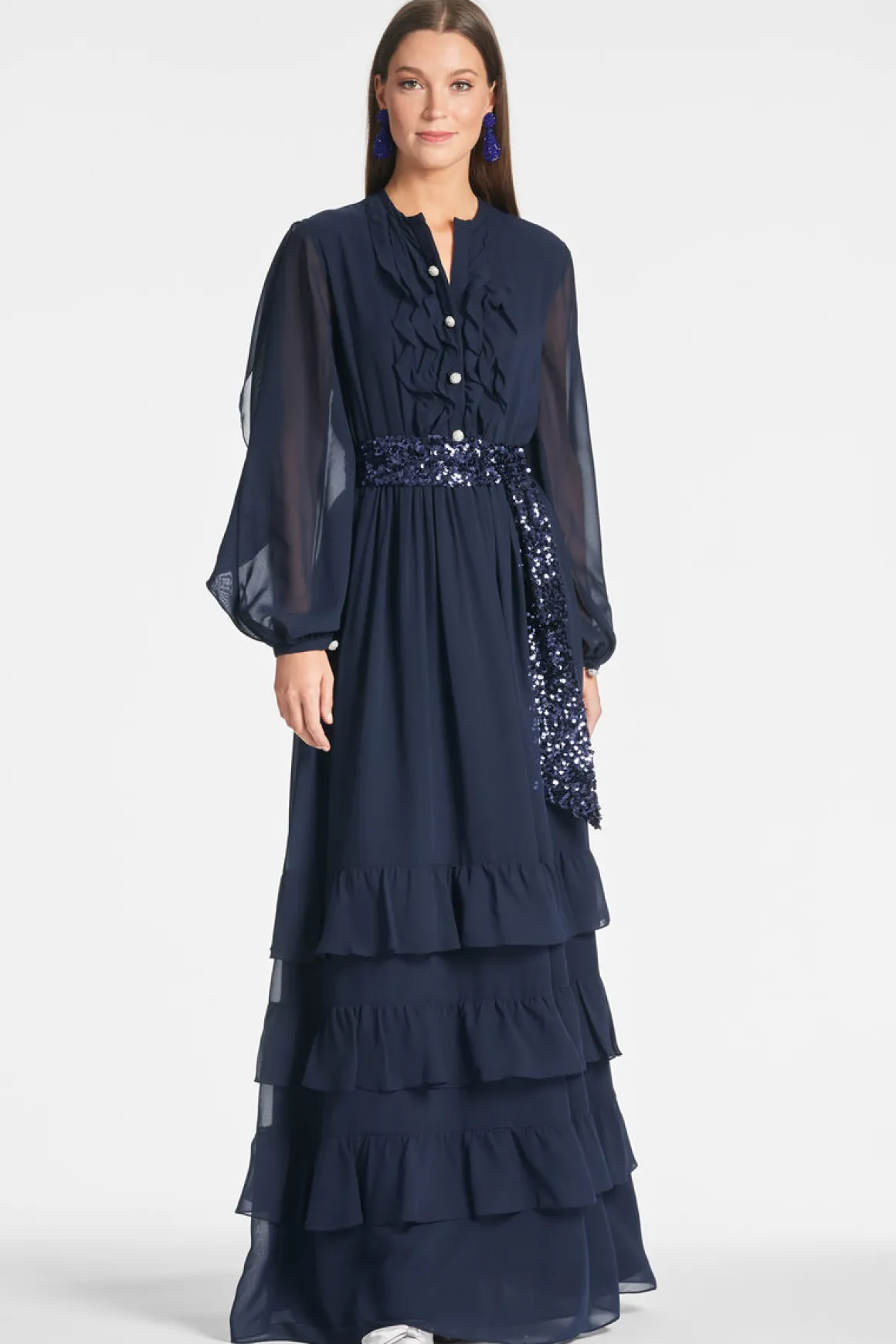 Prepare to make a statement in the Venus Gown in midnight. This solid chiffon piece is elegant yet modern, sophisticated yet flirty. She features sheer bubble sleeves, embellished front buttons with ruffles, and a self-tie complementary belt.