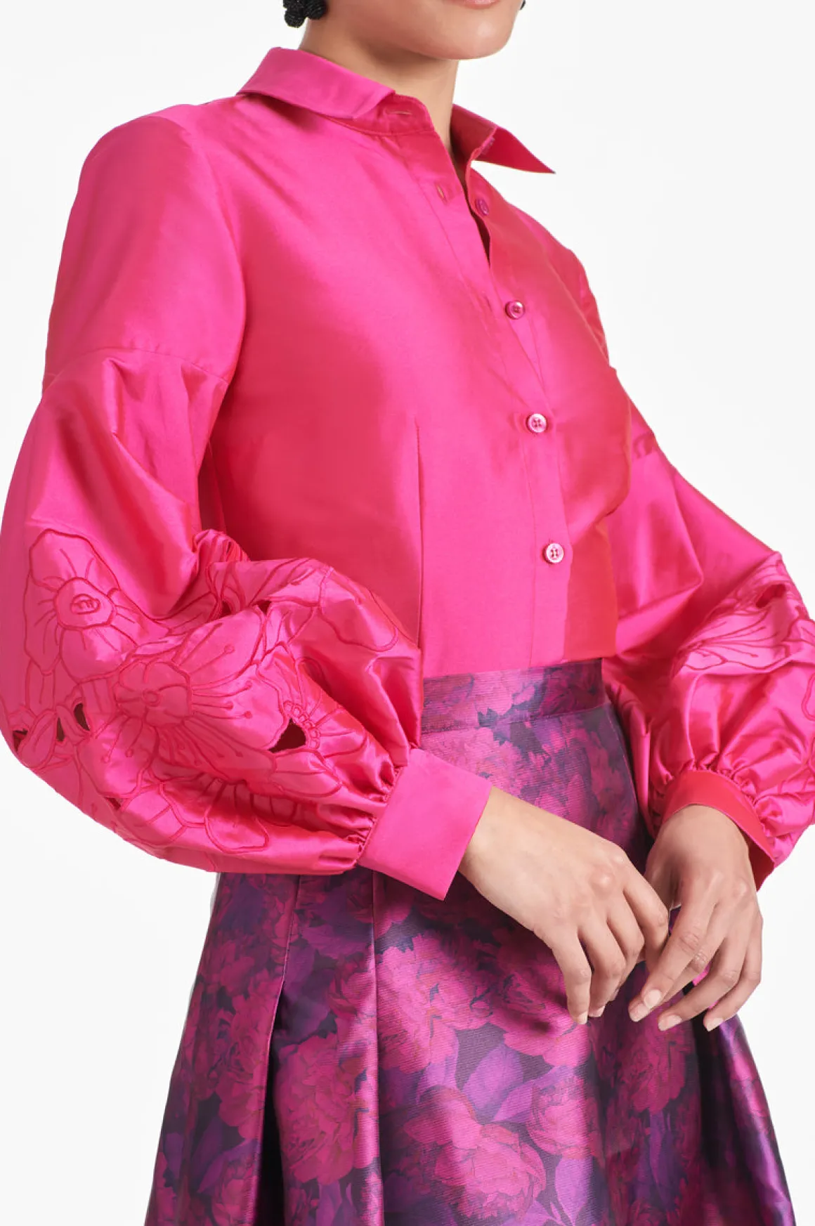 The Astor Top is a fashion essential that adds a unique touch to any wardrobe. It features an elegant, dramatic embroidered sleeve and princess seams for a flattering and refined fit. Its classic collar creates a timeless style that looks great for any occasion, and a romantic alternative to basic blouse.