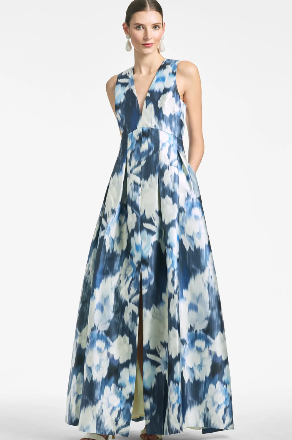 The Brooke is our V-neck gown with box pleats, peaked waist seam, and side pockets. This dress is what we consider to be a classic, essential silhouette, a perfect canvas for our most breathtaking prints.