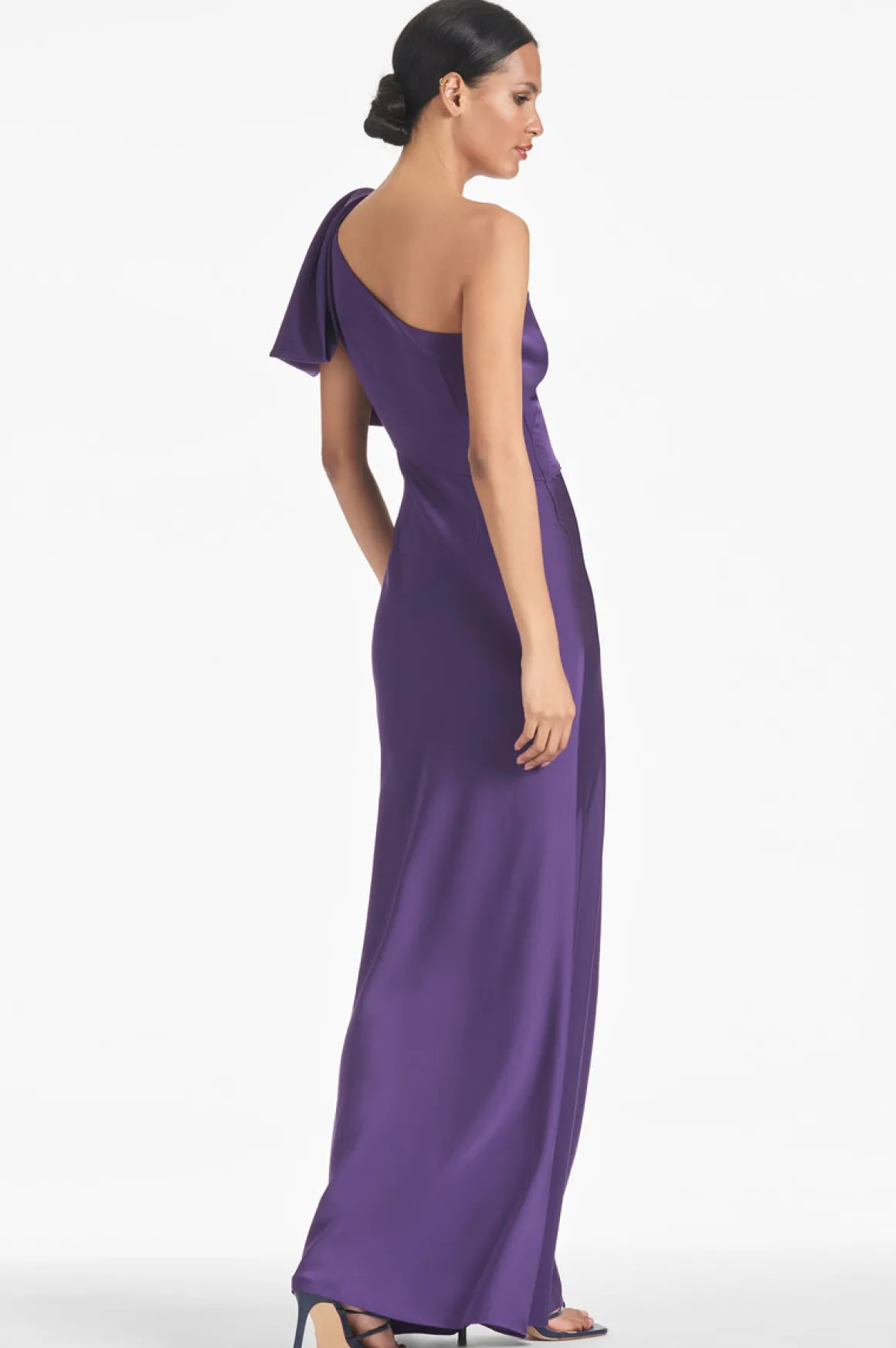 The Aubrey gown in amethyst is an example of balance by design. A sleek sleeve of charmeuse cut on the bias with an asymmetric seam at the waist creates a column for curves. At the shoulder sits a hand tucked collapsed bow adorned with hand-embroidered silver caviar beading at the knot.
