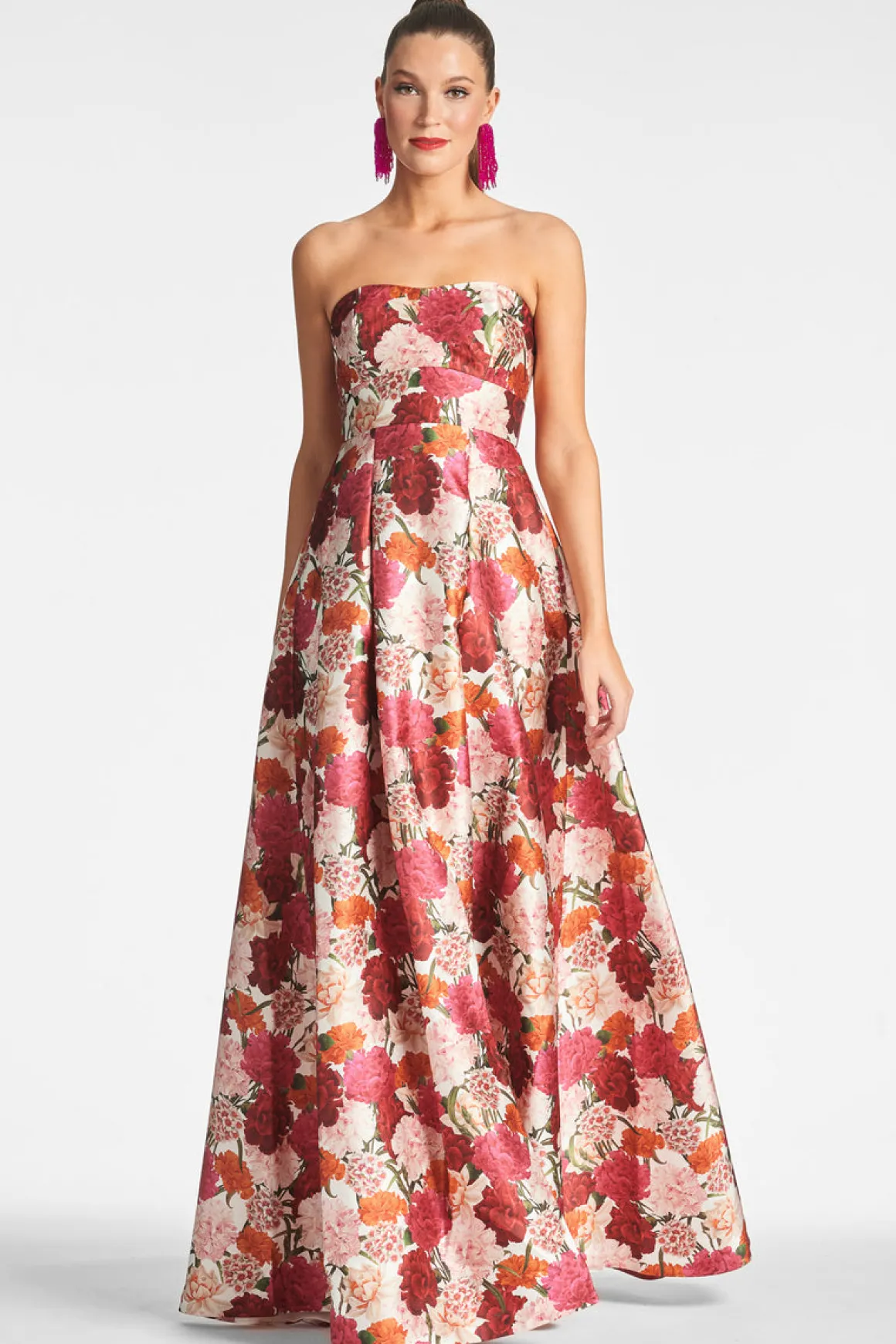 Giovanna is the ball gown that flatters in all the right places. Featured in an all-over floral print, she adds a touch of something special to an otherwise classic silhouette. Opt for natural makeup and throw on a pop of color clutch (On the Rocks in cerise, perhaps), and you have your next wedding, gala, or event look perfected.
