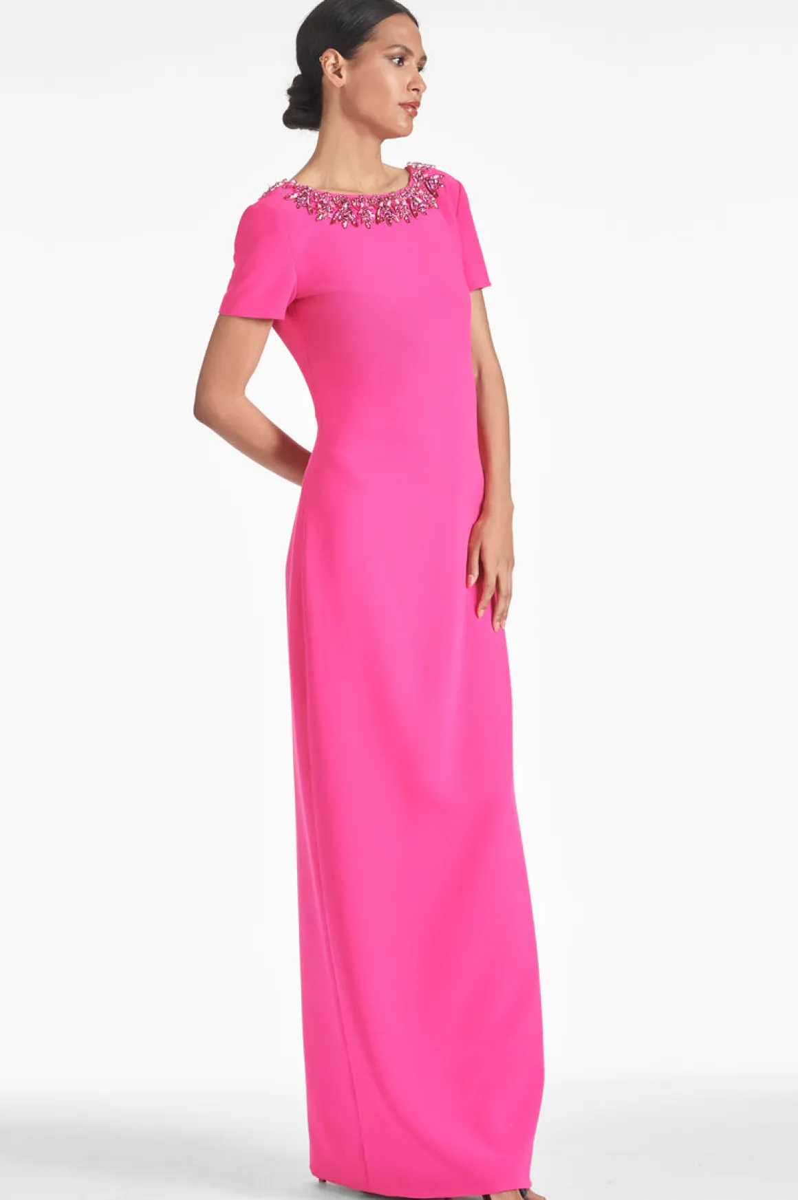 The Shiloh Gown is a gorgeous vision of luxury. A classic column cut with intricate embellishment at the neckline accented with glimmering sequins exude sophistication and elegance. The electric pink color complements all skin tones, while the short sleeve coverage offers a timeless look with a modern statement. Make your next event unforgettable in the Shiloh Gown.