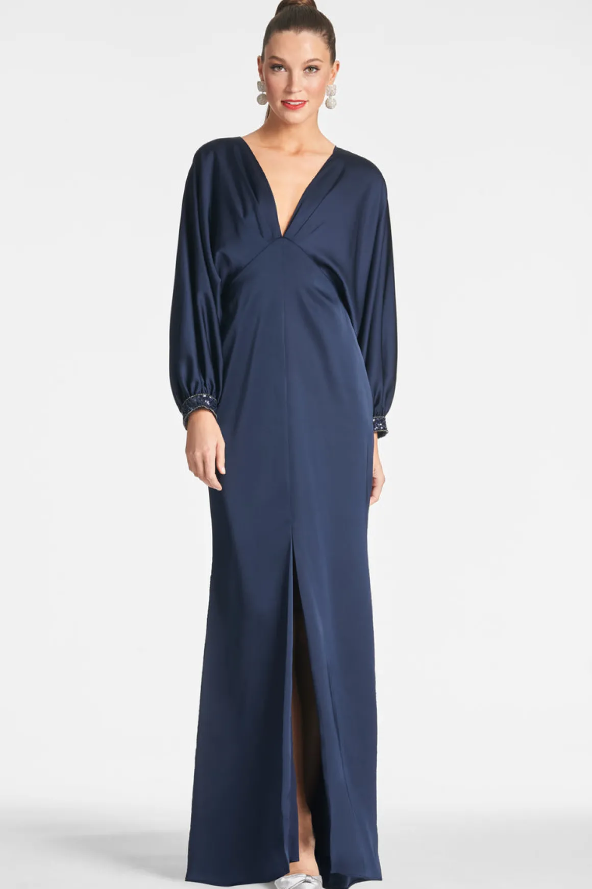 Maia is nothing less than chic, her relaxed silky silhouette definitely gives “Old Hollywood” glamour. Her deep V-neck still has enough coverage to feel appropriate without sacrificing the sultry effect of the gown. What we love is the embellishment at the cuffs, just a little something to set her apart from the crowd.