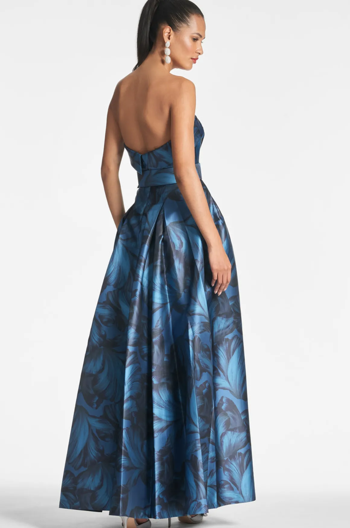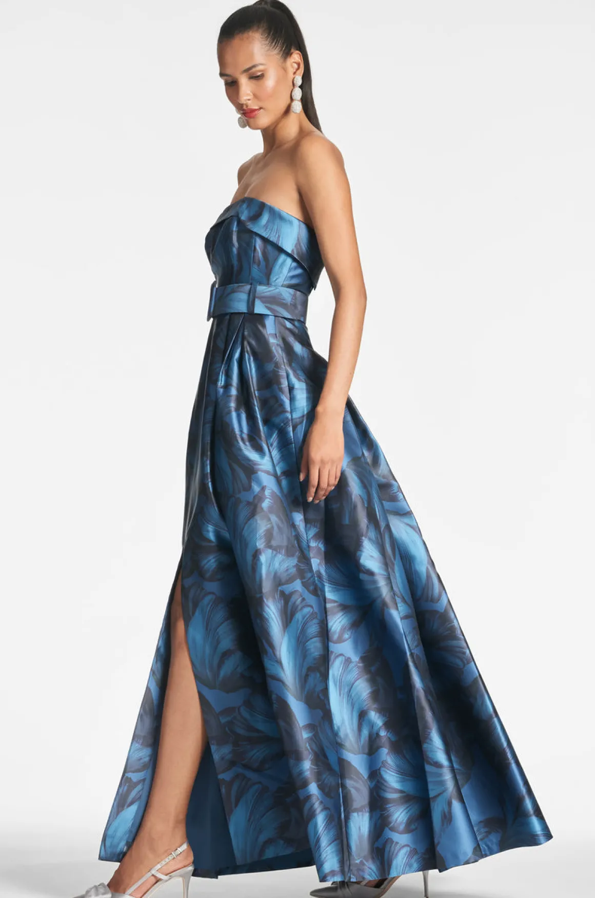 The Brielle gown is a vision in our uniquely romantic tonal petal print. The otherwise classic strapless silhouette has a specially designed envelope fold to add a bit of architectural interest.
