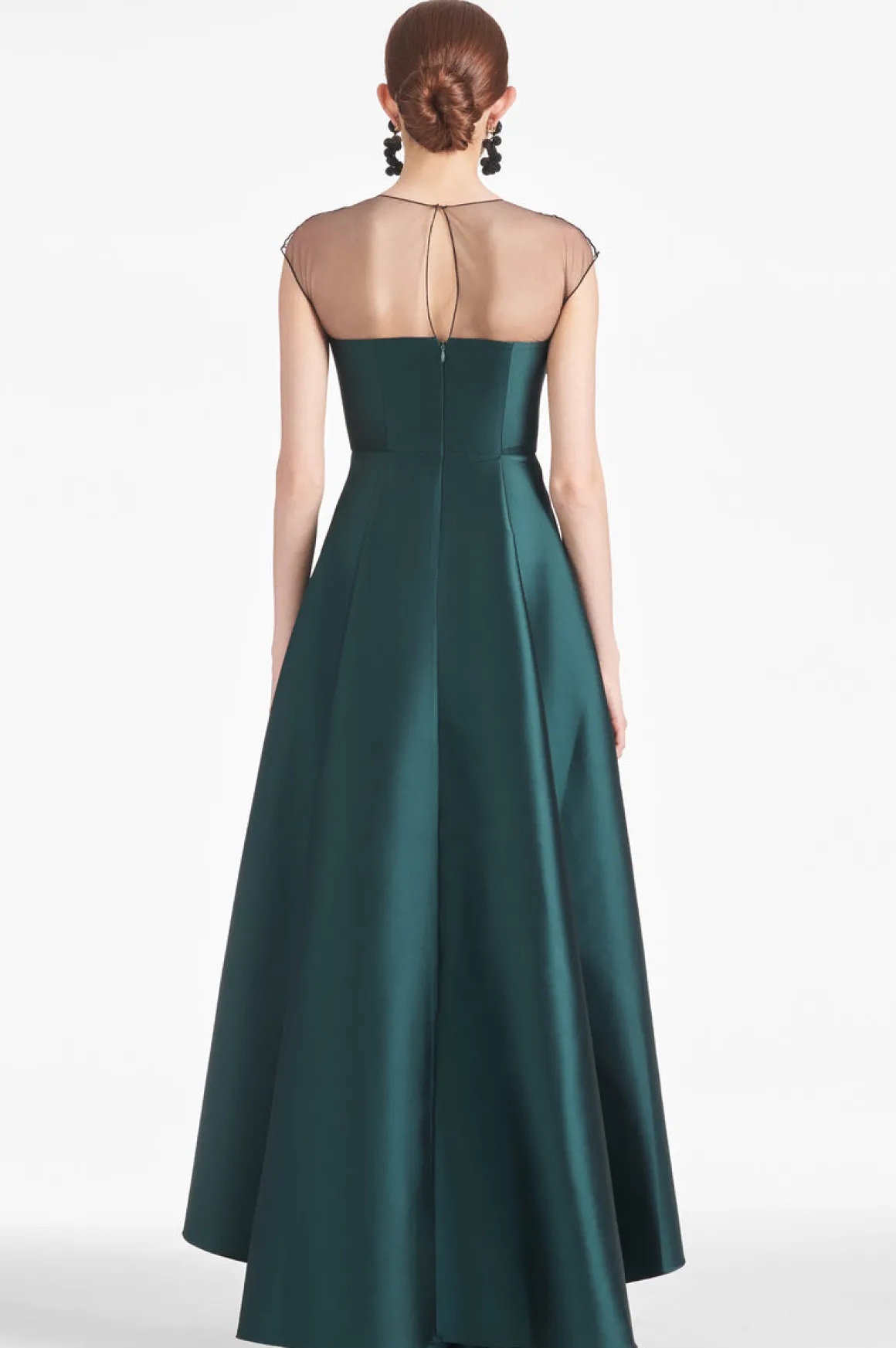 The Blakely gown in double stretch Mikado is both grand and elegant. It boasts Italian Lagattolla stretch-tulle at the neckline and cap sleeve adorned with a Hibiscus flower featuring a picot edge detail. The hi-lo effect of the skirt allows for modesty, as well as a peek at your favorite evening shoe.