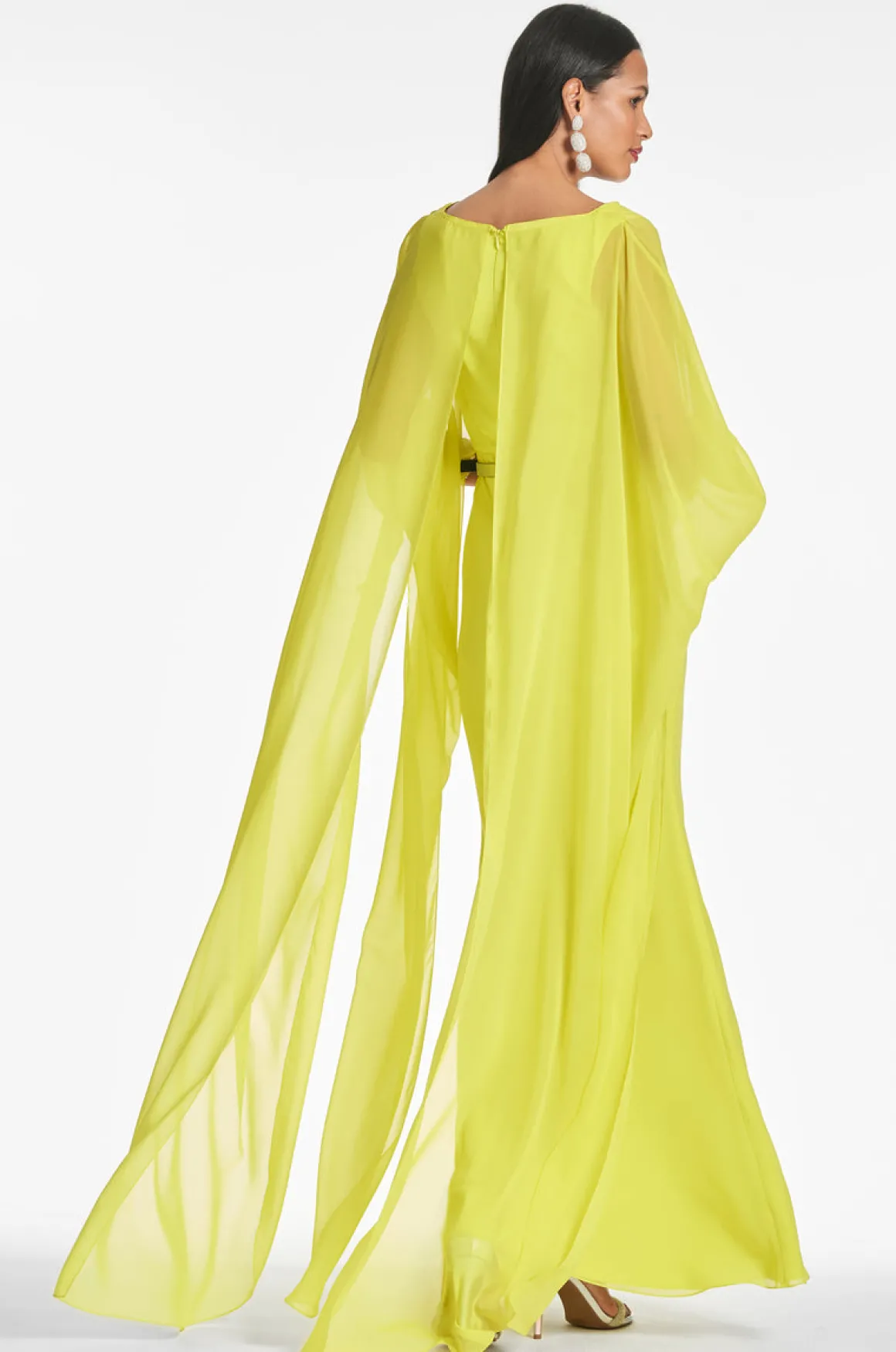 If you’re looking to turn heads, you’ve come to the right place. The Aphrodite gown in neon limeade is solid chiffon with perfectly placed multicolor gems on each cuff. Featuring dramatic sleeves and a waist cinch, she’s all about the drama, keeping fit and sophistication at the forefront.