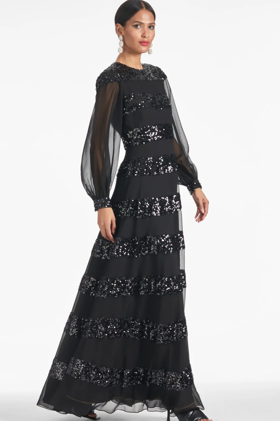 The Brenda gown is a chic, crewneck silhouette that marries the simplicity of a flattering a-line with the glamour of embellishment. This gorgeous black gown features sequin stripes that shimmer. Crafted from luxurious chiffon, the long sleeves and coverage will keep you feeling elegant and confident all night long.