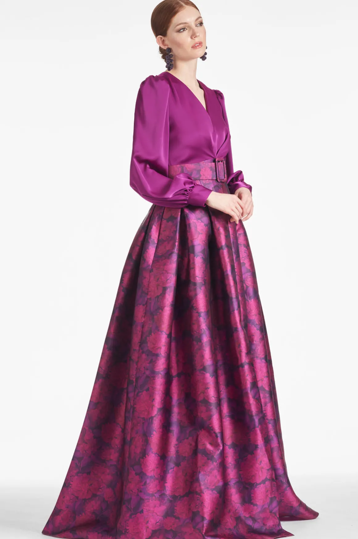 The Zoe Gown is the “Grande Dame” of the occasion. The deep V-neck sparkling grape satin crepe bodice meets the printed Mikado self-belt to join the classic ball skirt with its soft, box pleating. At the front a discreet, but still dramatic, front slit and at each side a side slit pockets.