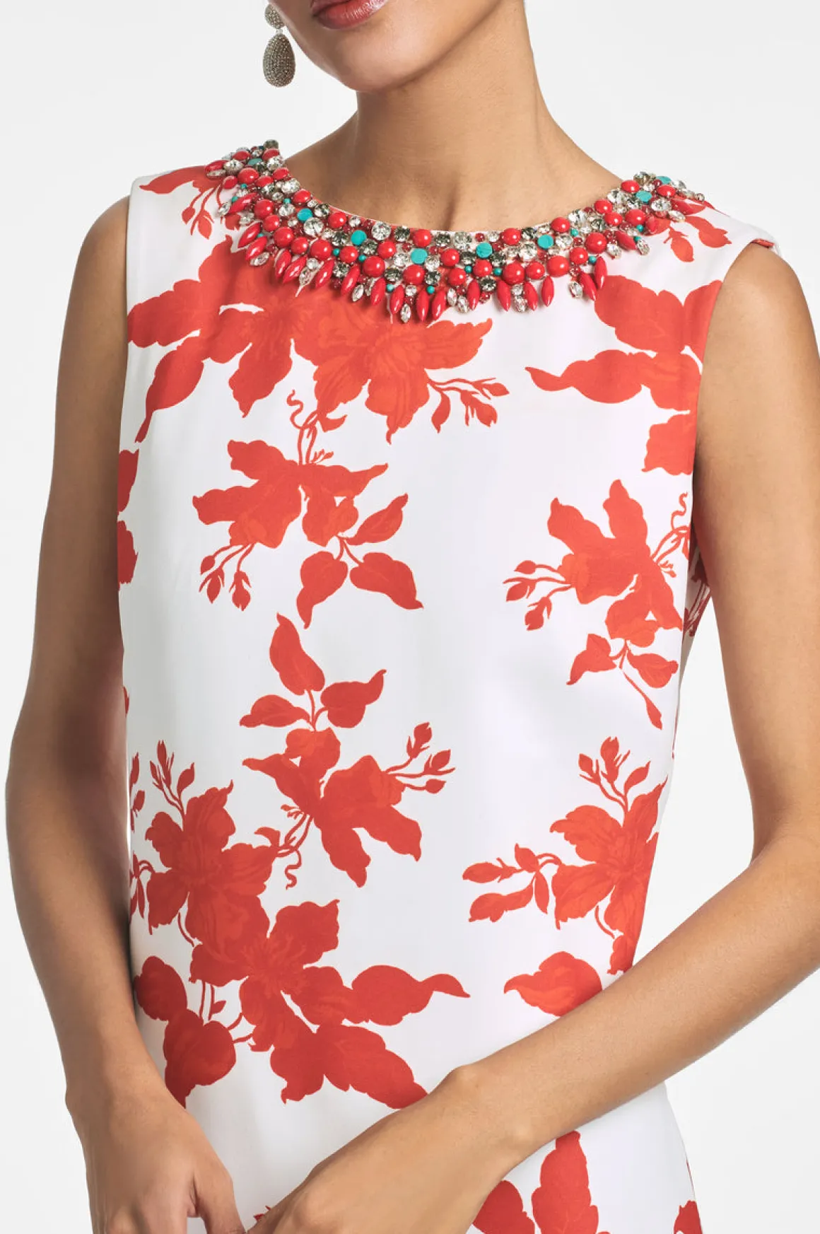 This sophisticated Juliana Gown features a figure-flattering form and an elegant summertime coral narcissus print. The stretch crepe column fit ensures comfort and ease of movement while a captivating bib necklace of faceted crystal, coral and turquoise adds a touch of sparkle.