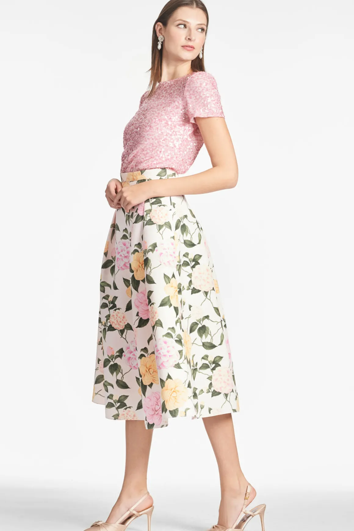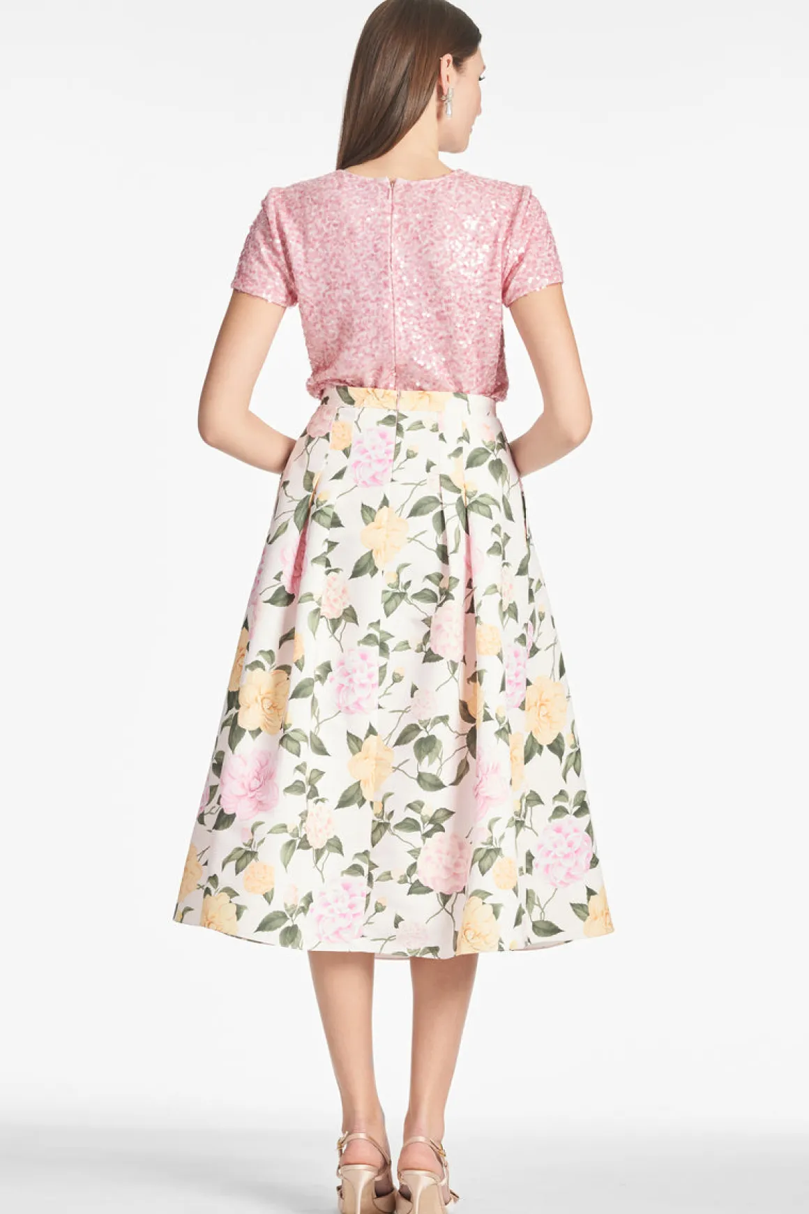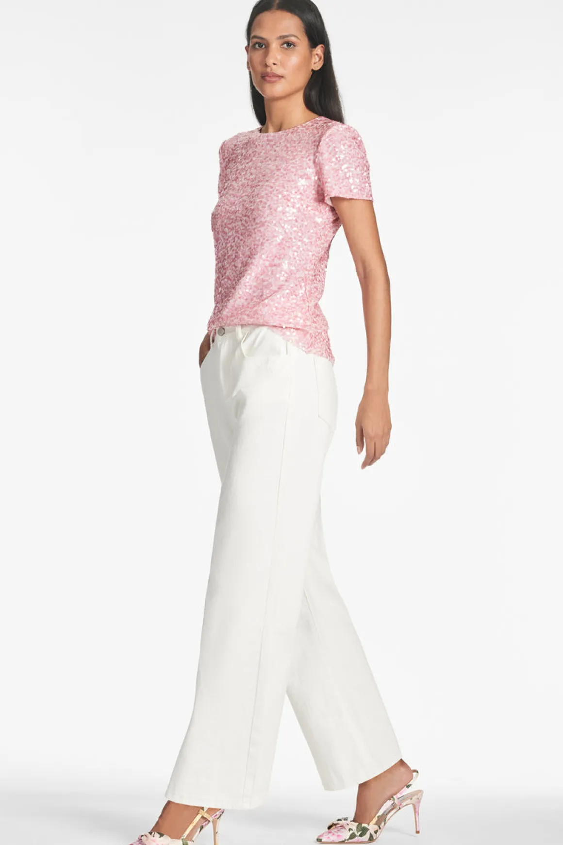 Cool meets glamor with the Veronica Top in Petal Pink. This fitted tee in allover scattered pale pink sequins has a fitted, crew neck bodice, with a back zipper for ultimate comfort and convenience. Pair her back to white jeans for a summer soiree or go all out with our pink lemonade print Astor skirt for a showstopping look.