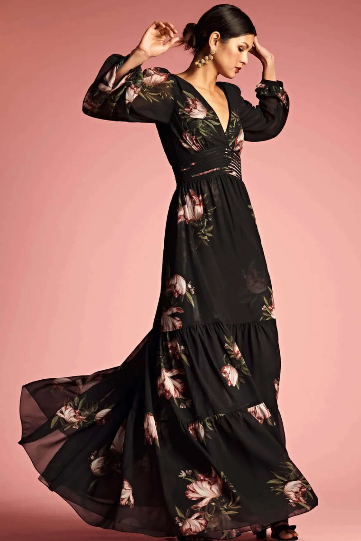 A vision of bohemian beauty, our Jules gown. Crafted from ethereal chiffon with a dreamy floral pattern, this gown is the perfect combination of romantic charm and modern sophistication. Its flattering empire waist flatters all figures, with a plunge v-neck. The moody floral and dark color palette offer an elevated look that is perfect for transitioning from Fall to Spring.