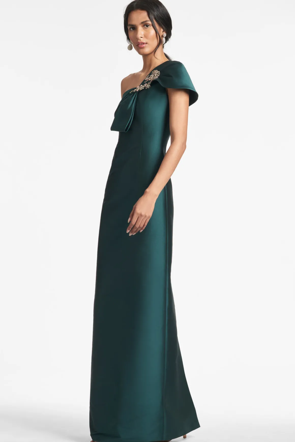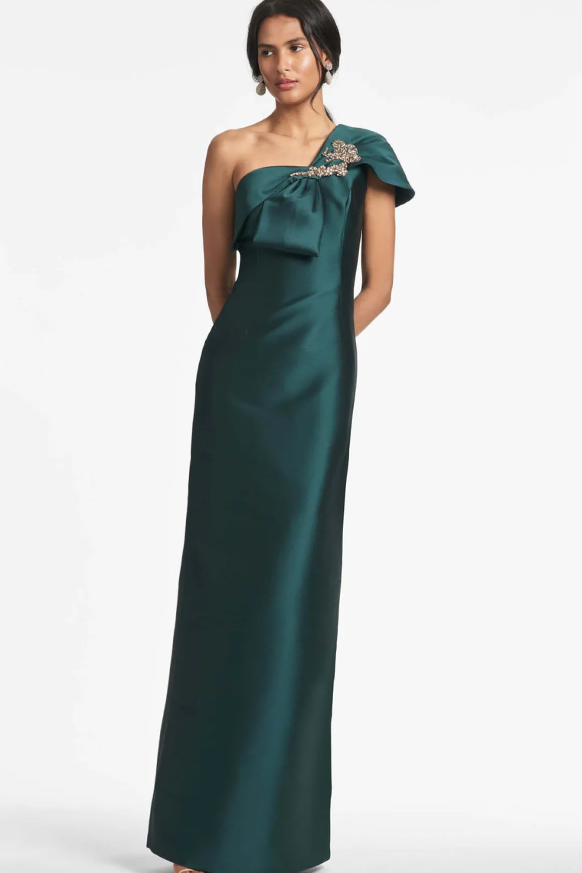 Wrapped in a sleeve of stretch Mikado, the Ines column gown glides over the form to create a clean and subtly sexy silhouette. At one shoulder a swath of Mikado is fashioned into a sculptural sash, adorned with crystals, reminiscent of an heirloom broach.
