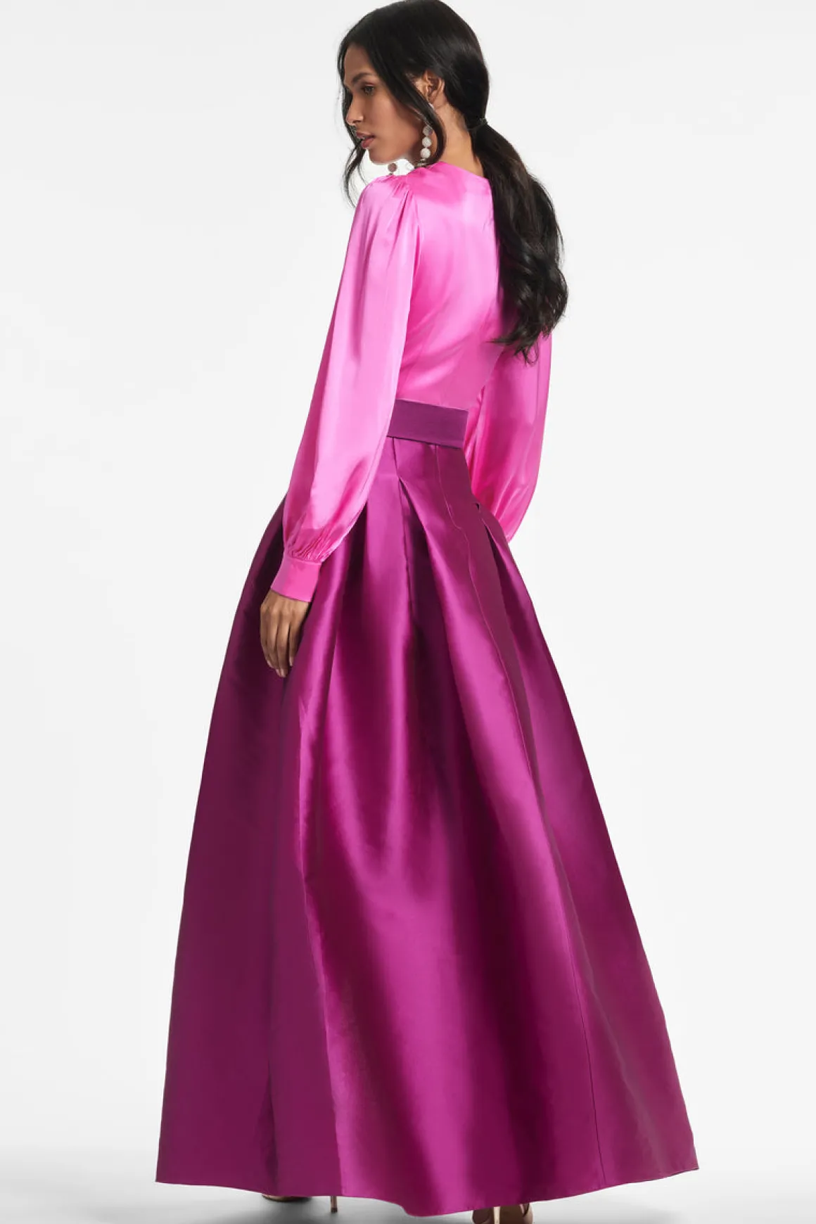 The Zoe Gown is the “Grande Dame” of the occasion. The deep V-neck pink satin crepe bodice meets the printed Mikado self-belt to join the classic ball skirt with its soft, box pleating. At the front a discreet, but still dramatic, front slit and at each side a side slit pockets.