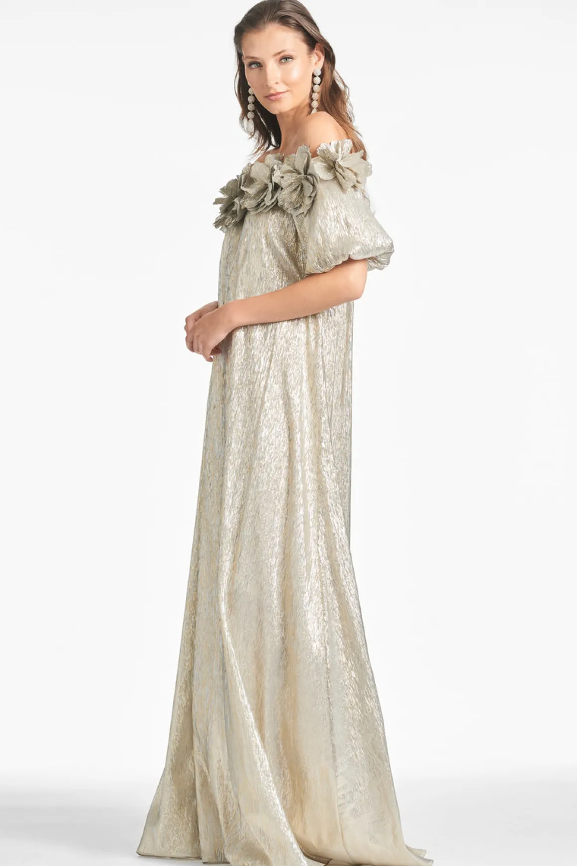 A goddess imagined! Valentina’s made of a silk lamé fabric in the most magnificent, muted metallic shade. Shimmering both silver and gold, her off-the-shoulder silhouette is amplified by a line of hand made floral embellishments across the chest. She’s ethereal, she’s feminine, and she is most definitely the moment.