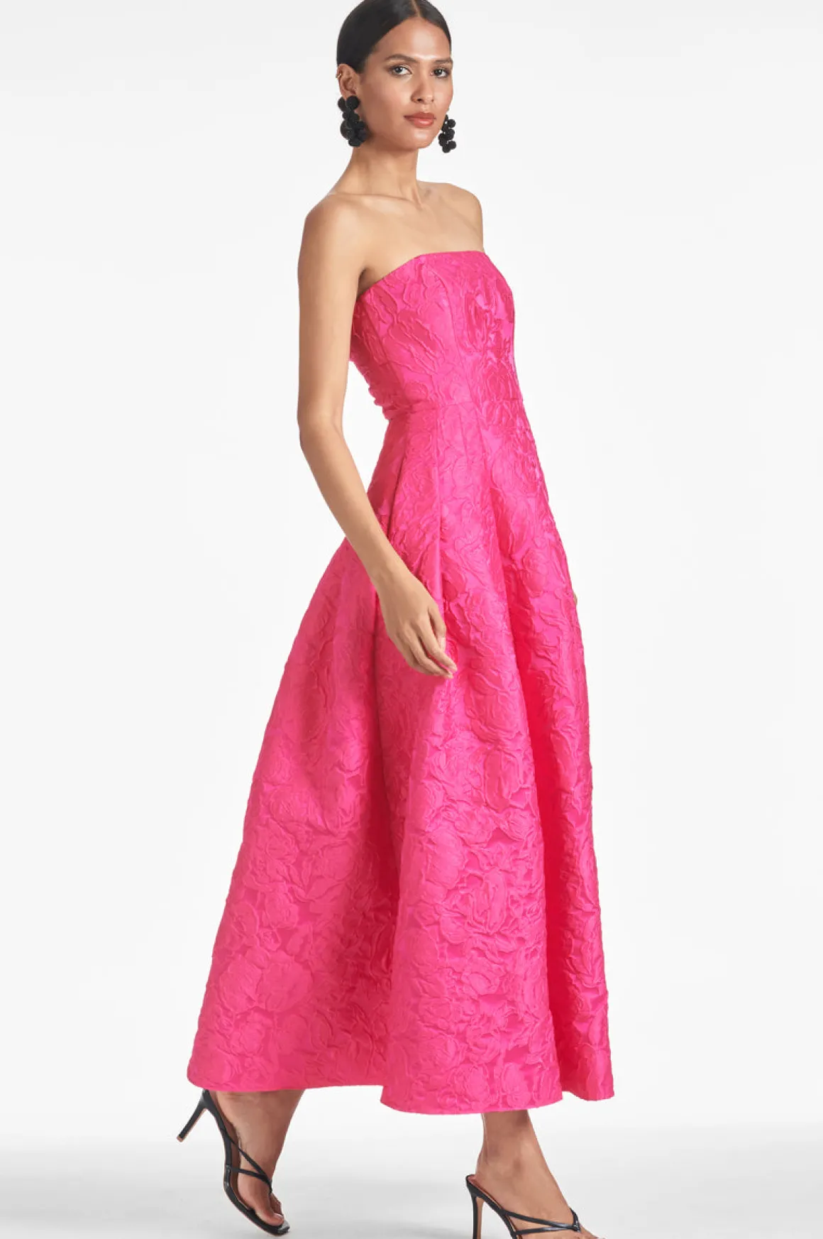 Our strapless ankle-length party dress in Cloque. At back a bit of a surprise, double band open back detail. A clean waist meets deep pleats allowing for a fabulous drape. Let’s not forget what we never do, pockets!