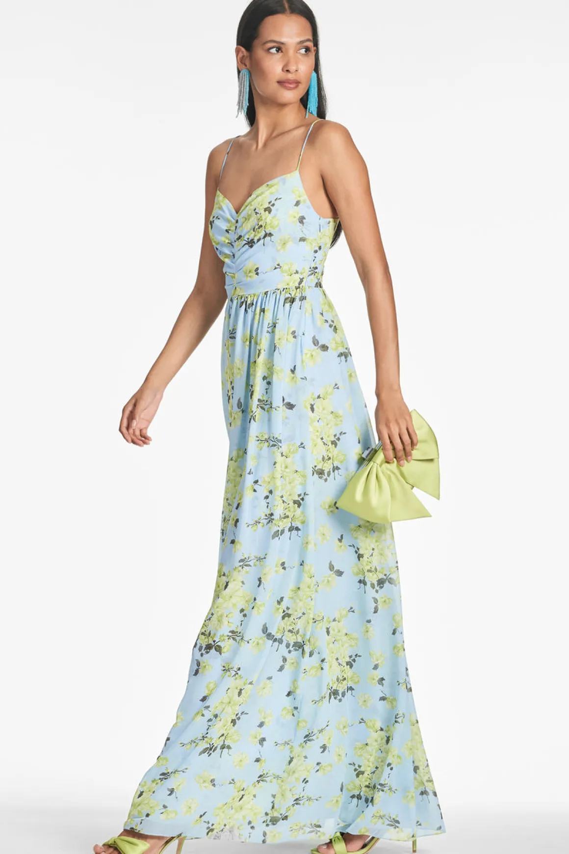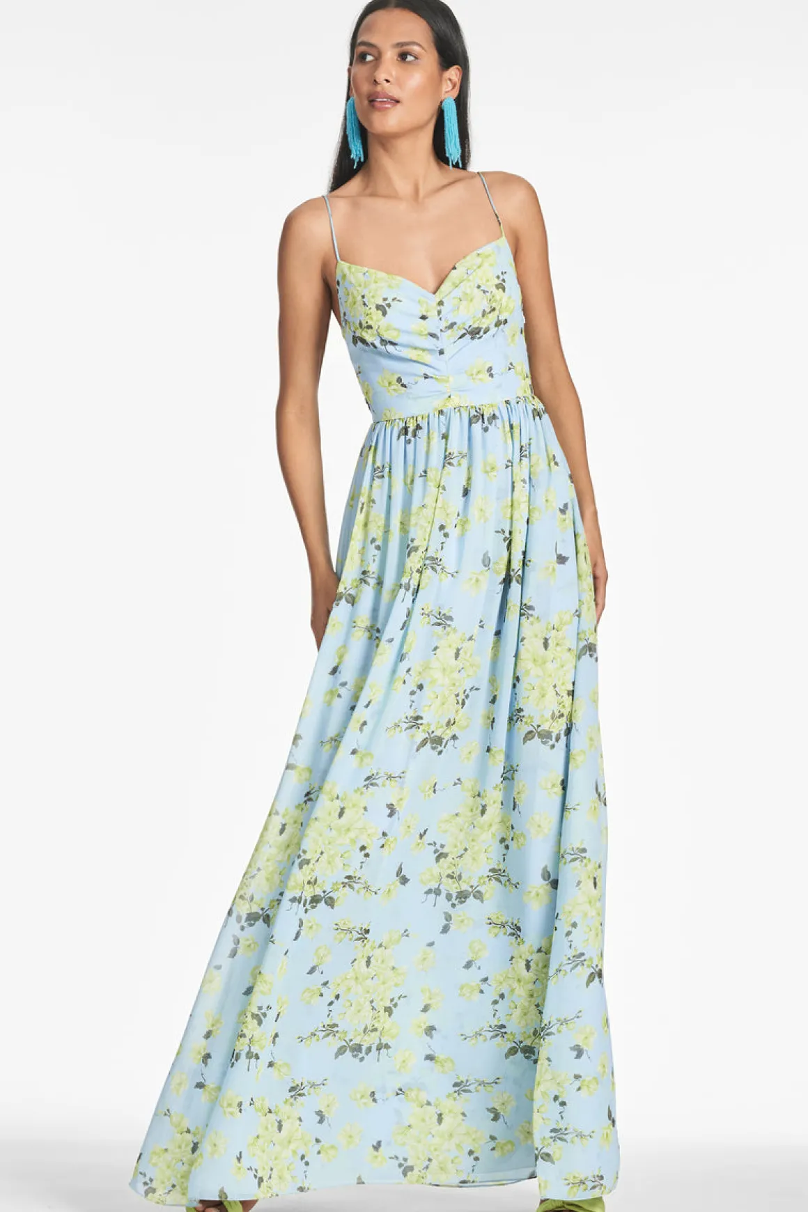 Sienna is a printed chiffon dream. She’s a classic maxi silhouette with a subtle V neckline and smocking at the back. Look no further for your perfect Spring and Summer event dress.
