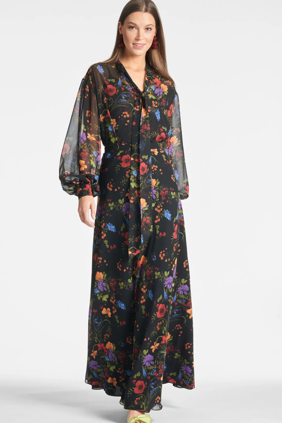 If you’re looking for versatility and wearability, you’ve come to the right place with the Nora top in Noir Wildflower. This printed chiffon blouse is just the right amount of whimsical and practical. Pair her back to the matching skirt or your favorite black trousers for a timeless, sophisticated look.