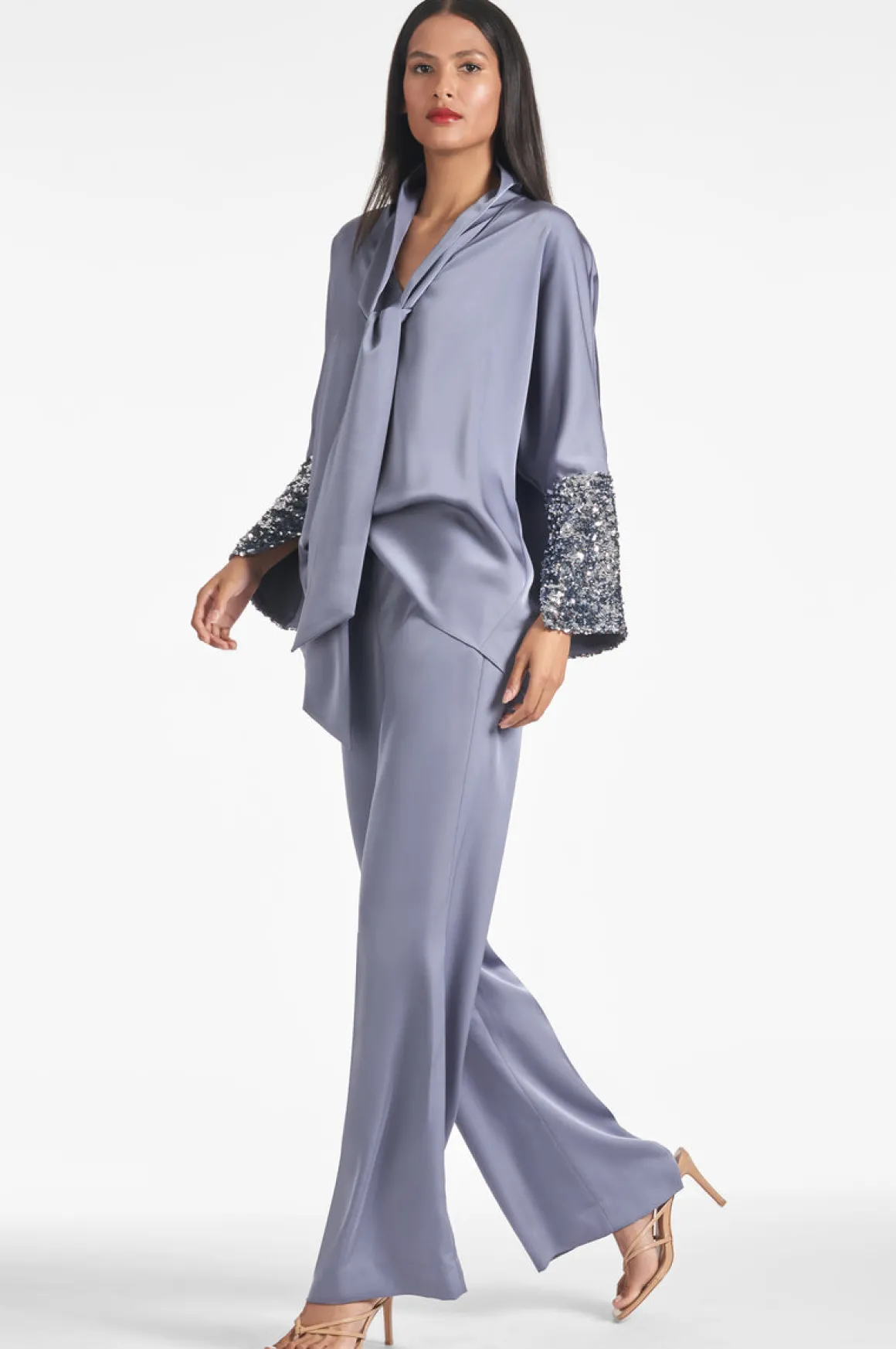 The Reid Top is a stylish, easy-to-wear, relaxed fit statement piece. The cool grey hue makes it perfect for any time of day, from a day at the office to a night out, with a self tie at the neckline and sequin detailing on the sleeve to add that extra shine, Reid is a standout. Pair back to the matching Bri pants or with your favorite jeans or leather.