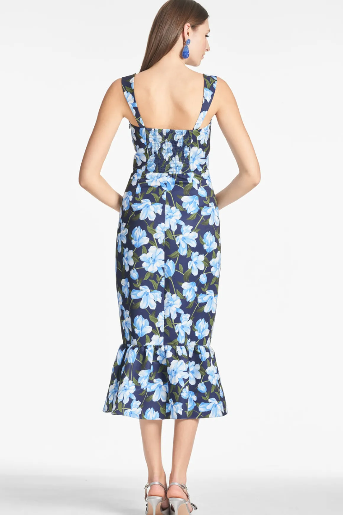 This is a shape that gives leading-lady, siren vibes. Sometimes the simplest things take the most time and engineering. This dress hugs and forgives in all the right places. Smocking at back allow for what feels and looks like a custom fit. Tapered straps top a trim sheath dress of floral printed faille finished with an off-center slit.