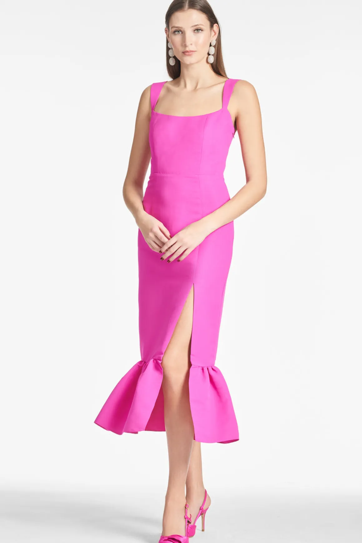 This is a shape that gives leading-lady, siren vibes. Sometimes the simplest things take the most time and engineering. This dress hugs and forgives in all the right places. Smocking at back allow for what feels and looks like a custom fit. Tapered straps top a trim sheath dress in cerise finished with an off-center slit.