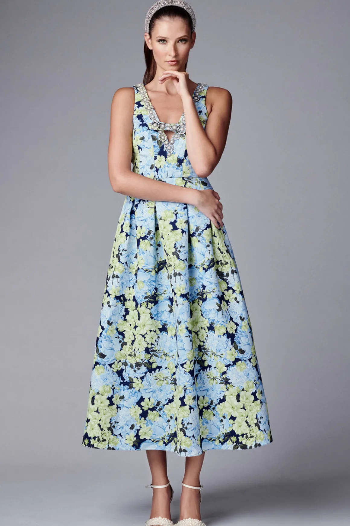 Meet Millie: a must-have midi in the perennial fit and flare silhouette. She’s the best of both worlds: flirty and fun in the bodice, and elegant from the waist down. Seen here in our Garden Club print, the peonies and magnolias add to its wearability. To top it all off: the v-neck is traced in crystals and pearls and with a fully embellished bow-tie at the center.