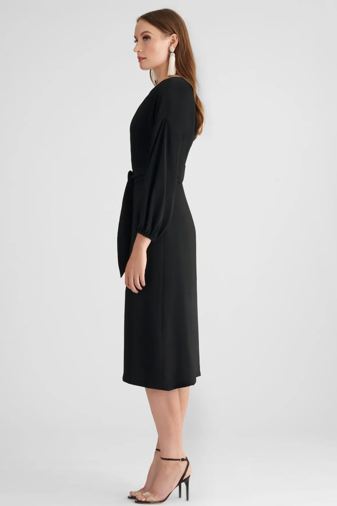 If ever there was a dress that could go anywhere it is Annie. The clean lines of this chic sheath are punctuated by an elegant and understated bracelet sleeve ruched at the cuff to create a subtle volume, center front slit, and self-sash. The lightweight crepe drapes elegantly and is considered an ideal 3 season fabric.