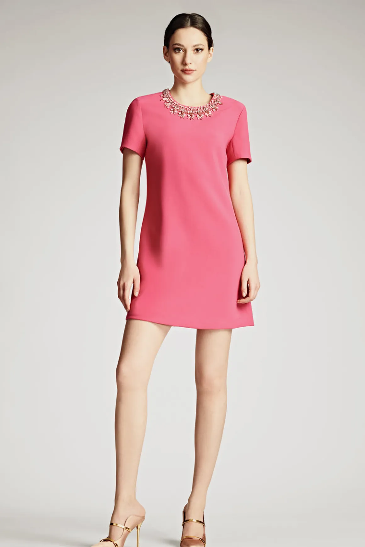 The Lauren Dress is a perfect staple. Its rose pink color and short sleeve design make it ideal for day to night transition. The mini dress features an embellished neckline which adds a sophisticated touch, wearable for any occasion. A must-have for any wardrobe, this dress is delicate, feminine, and flattering.