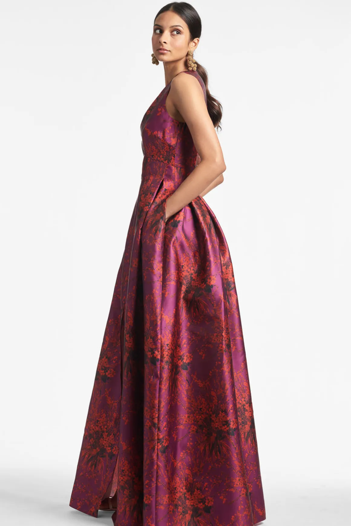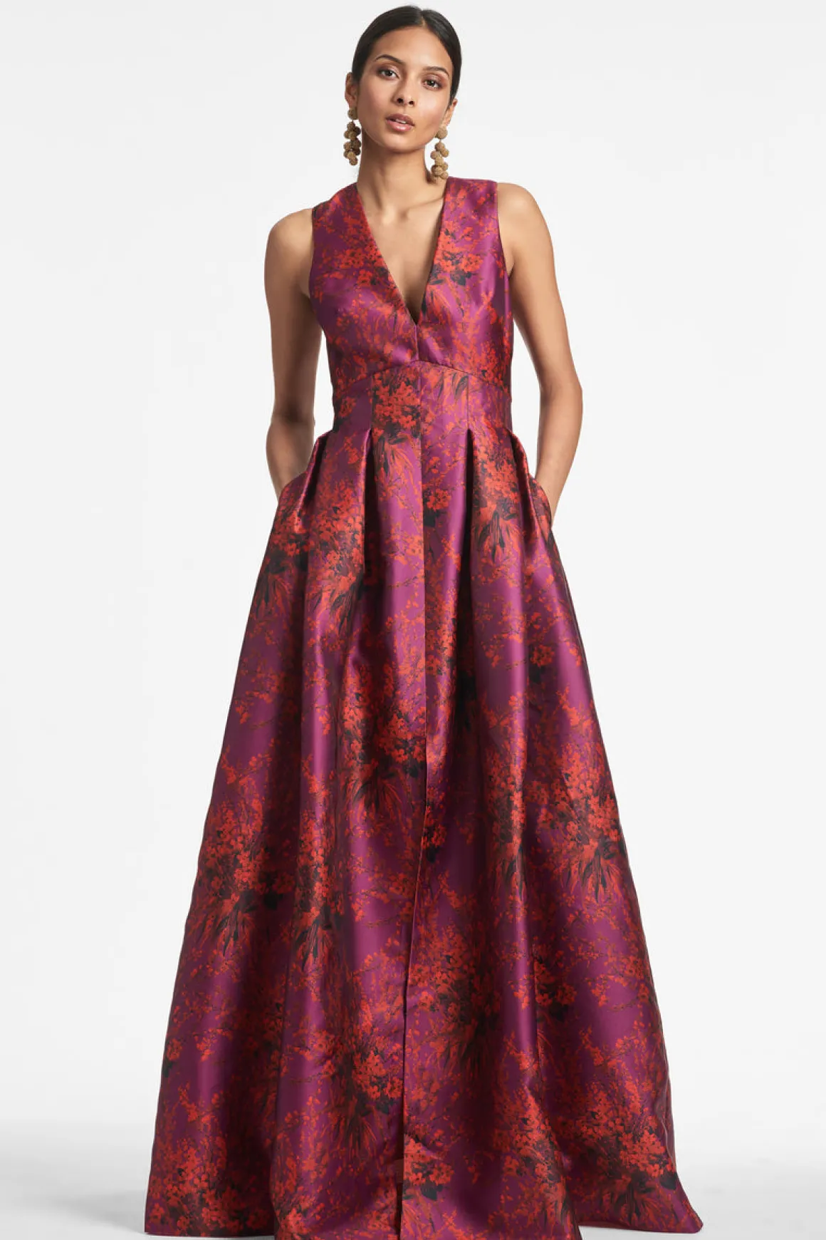 The Brooke is our V-neck gown with box pleats, peaked waist seam, and side pockets. This dress is what we consider to be a classic, essential silhouette, a perfect canvas for our most breathtaking prints.