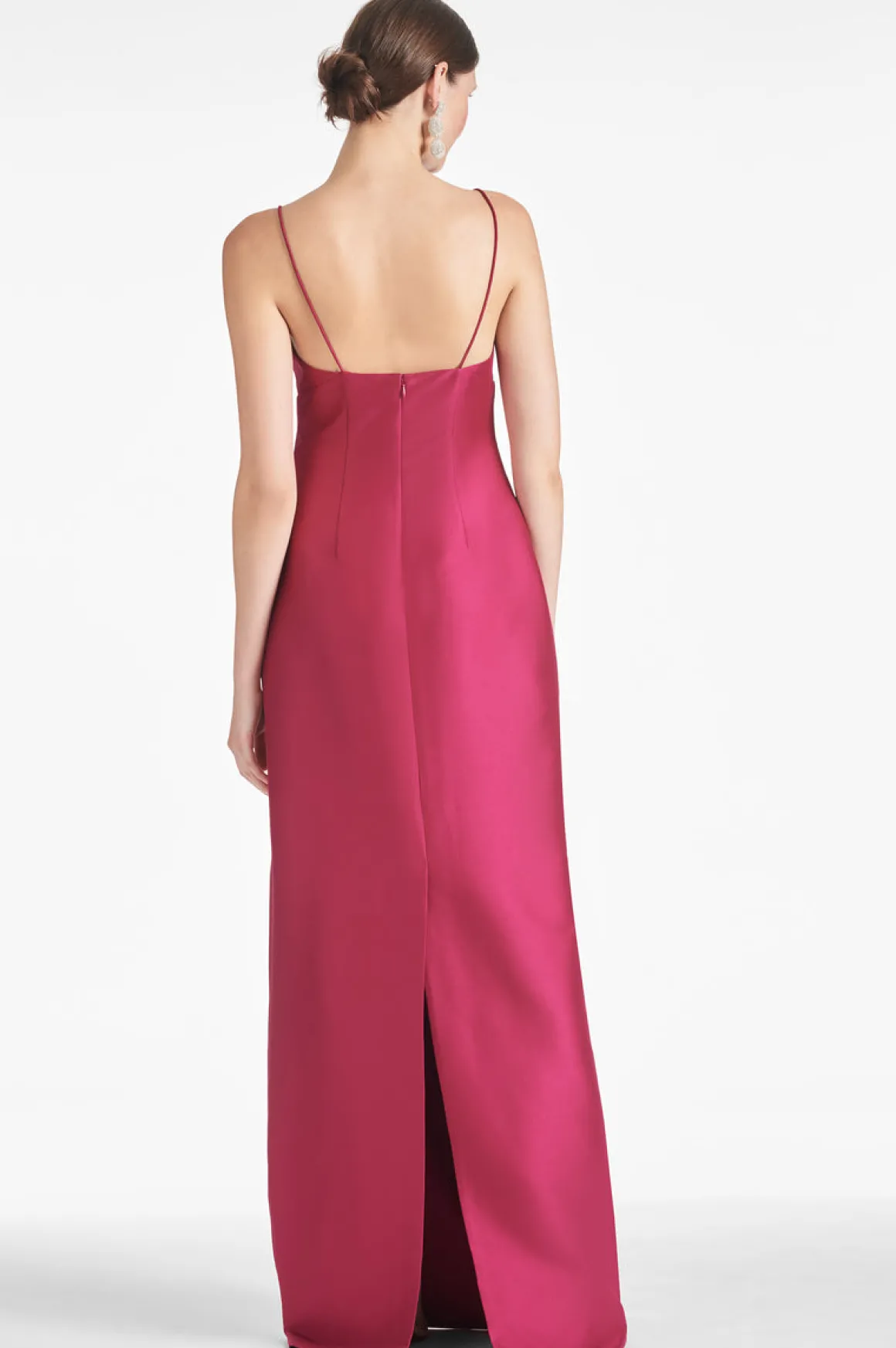 Sometimes the best answer is the most simple one, and that is true for the Pryce gown. A stunning column dress in stretch Mikado, she’s delicately adorned with crystal clips in a stunning shade of rhodolite.