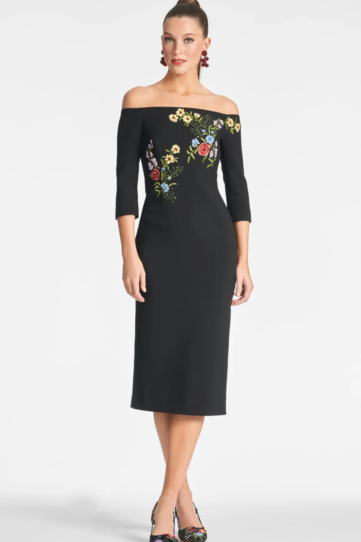 This timeless classic, the Fatima Dress, is crafted from stretch crepe black fabric, boasting an elegant off-the-shoulder design with tasteful minimal embellishments for a subtle touch of sophistication. She’s an exquisite look that goes beyond the traditional LBD.