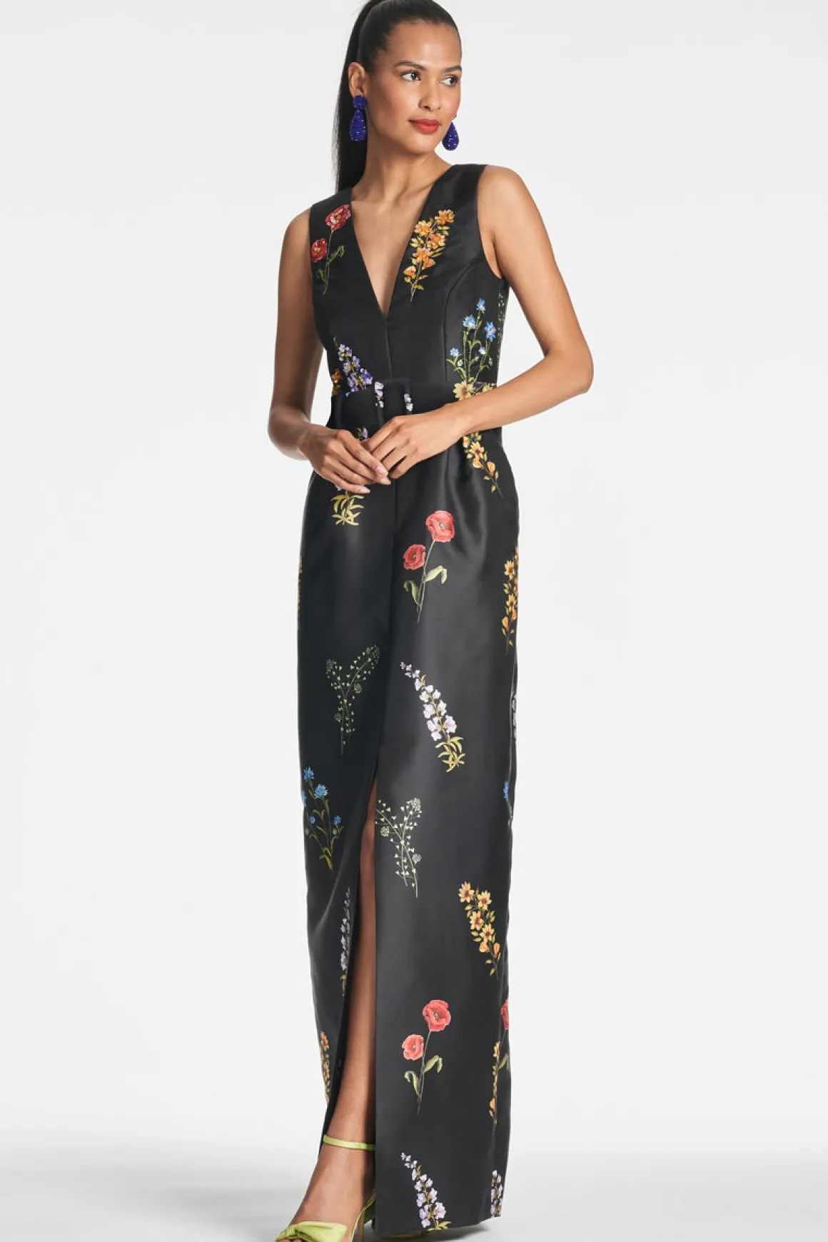 The Marsden gown combines luxury with glamour in an effortless way. She boasts a V-neck bodice with a waist belt, a front center slit, and we can’t forget the hand-embroidered noir bouquet floral print throughout. This is a classic dress that you’ll wear for years to come.