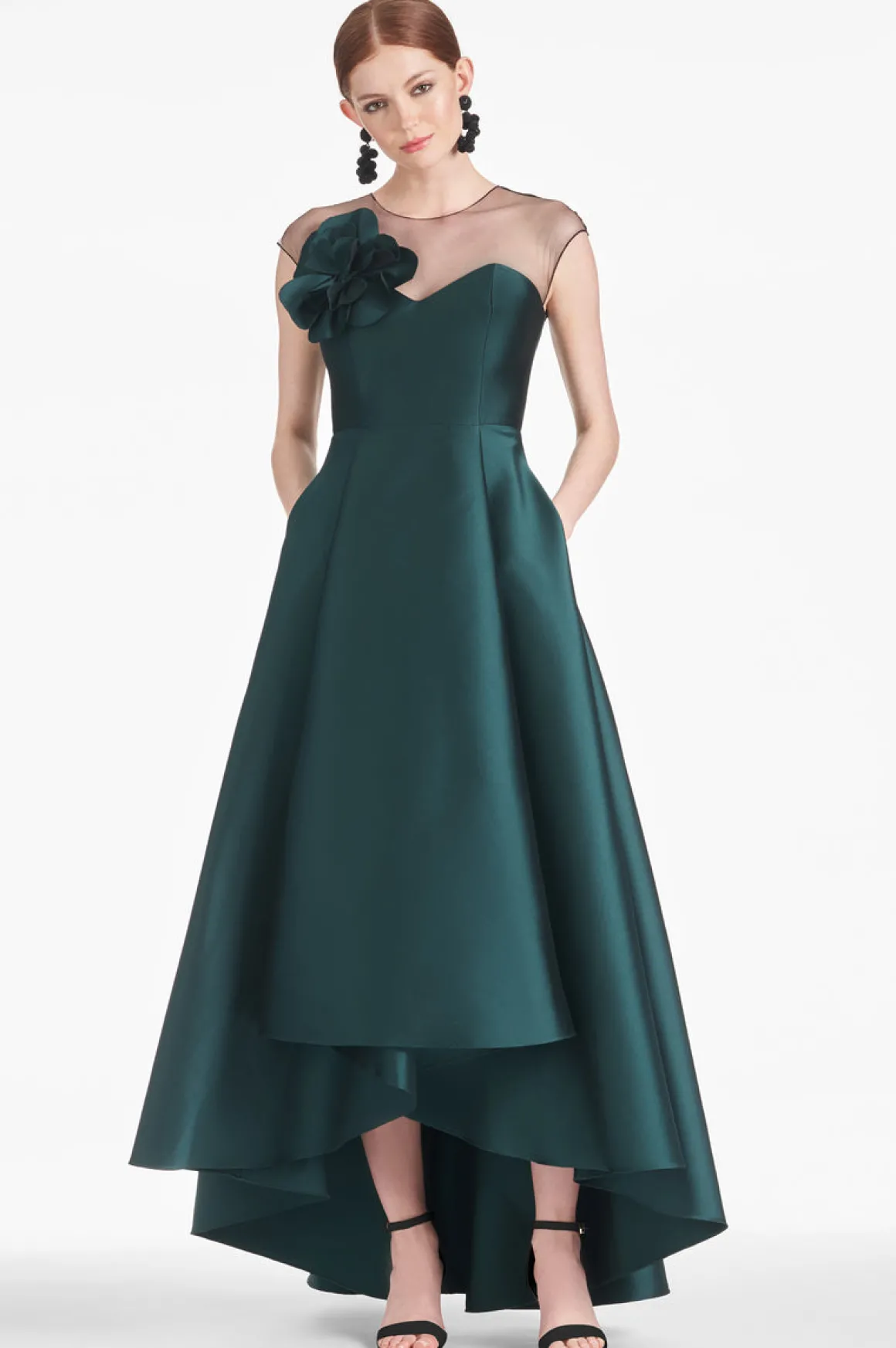 The Blakely gown in double stretch Mikado is both grand and elegant. It boasts Italian Lagattolla stretch-tulle at the neckline and cap sleeve adorned with a Hibiscus flower featuring a picot edge detail. The hi-lo effect of the skirt allows for modesty, as well as a peek at your favorite evening shoe.