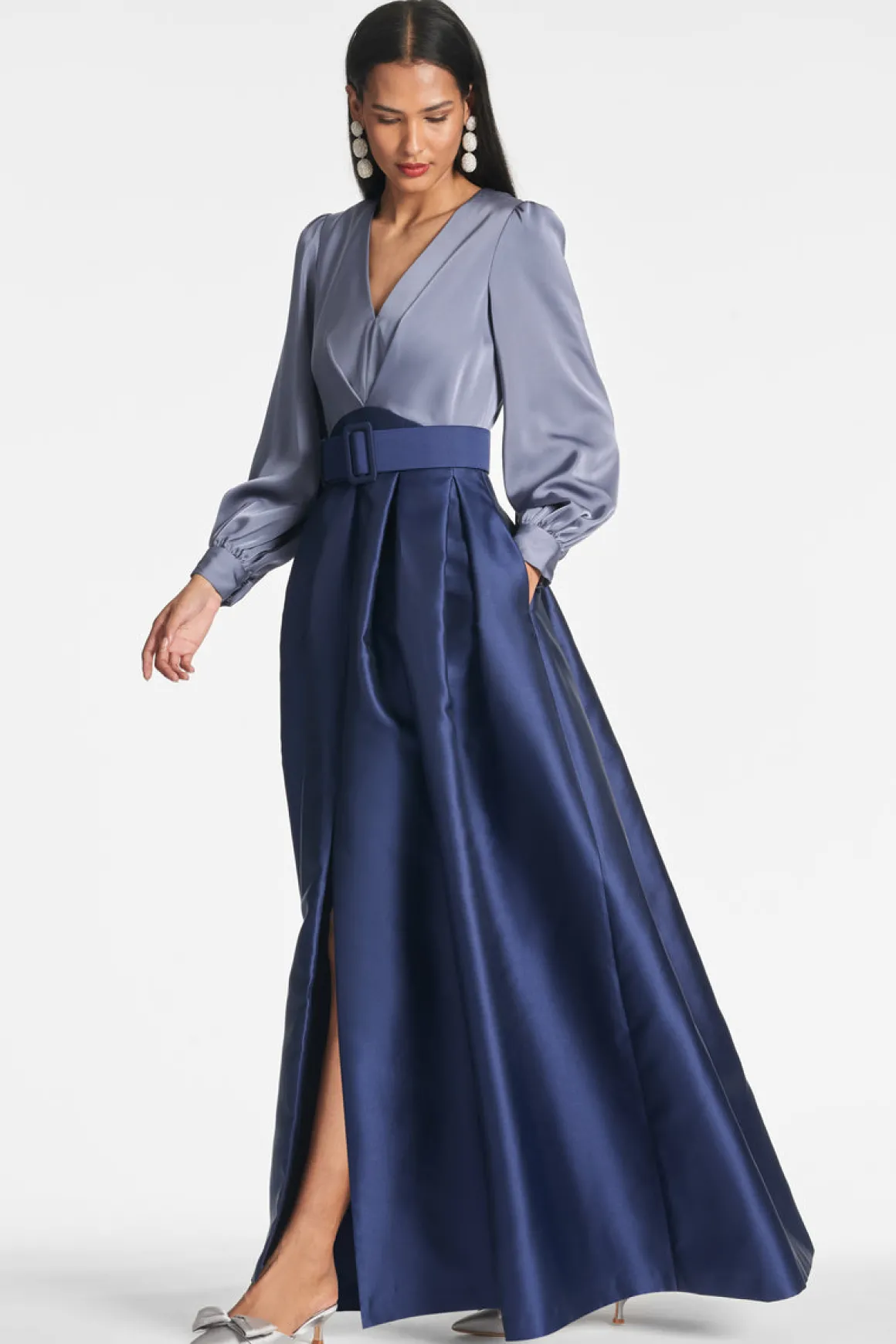 The Zoe Gown is the “Grande Dame” of the occasion. The deep V-neck smokey slate satin crepe bodice meets the printed Mikado self-belt to join the classic ball skirt with its soft, box pleating. At the front a discreet, but still dramatic, front slit and at each side a side slit pockets.