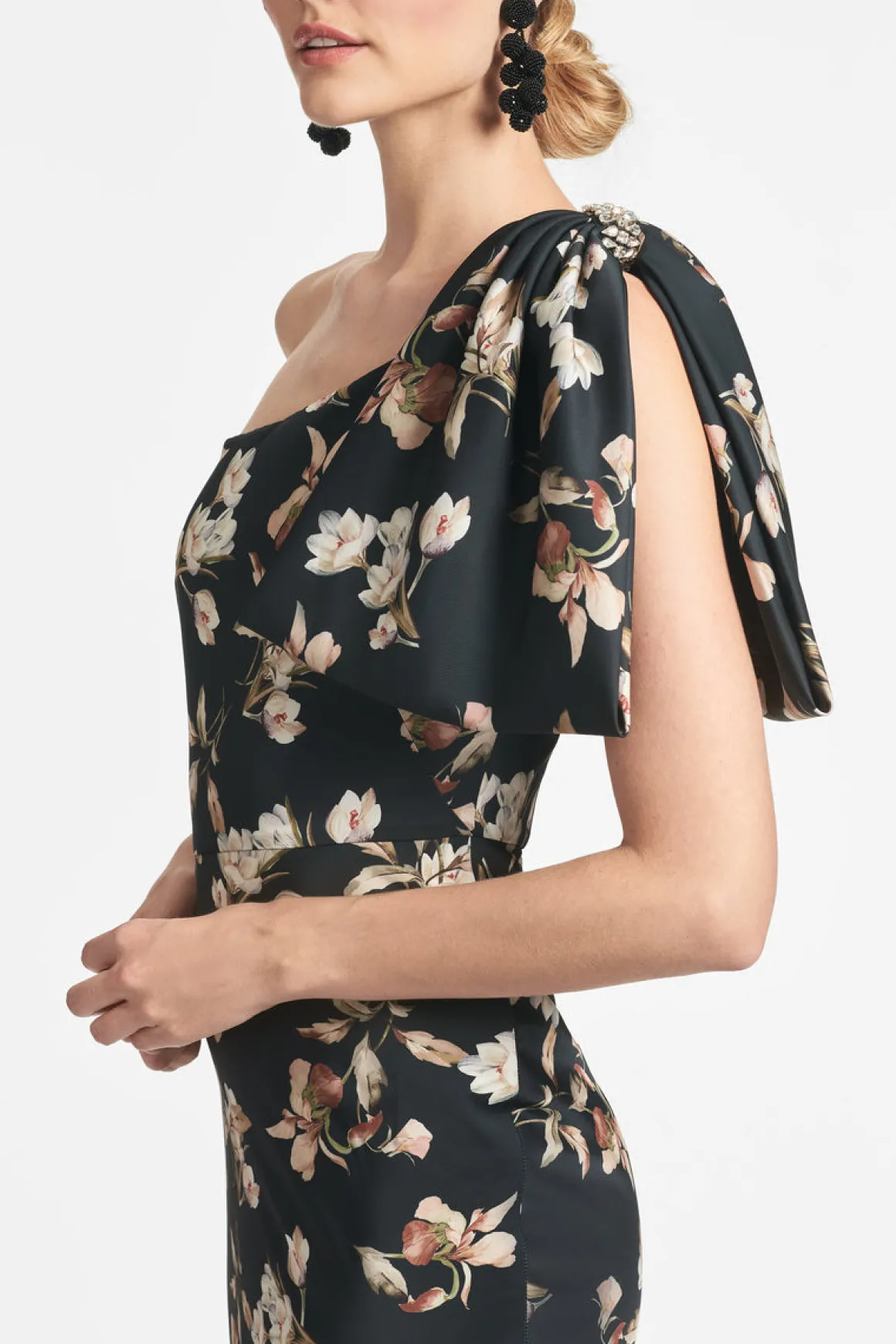 The Aubrey gown in black venetia petal print is an example of balance by design. A sleek sleeve of charmeuse cut on the bias with an asymmetric seam at the waist creates a column for curves. At the shoulder sits a hand tucked collapsed bow adorned with hand-embroidered silver caviar beading at the knot.