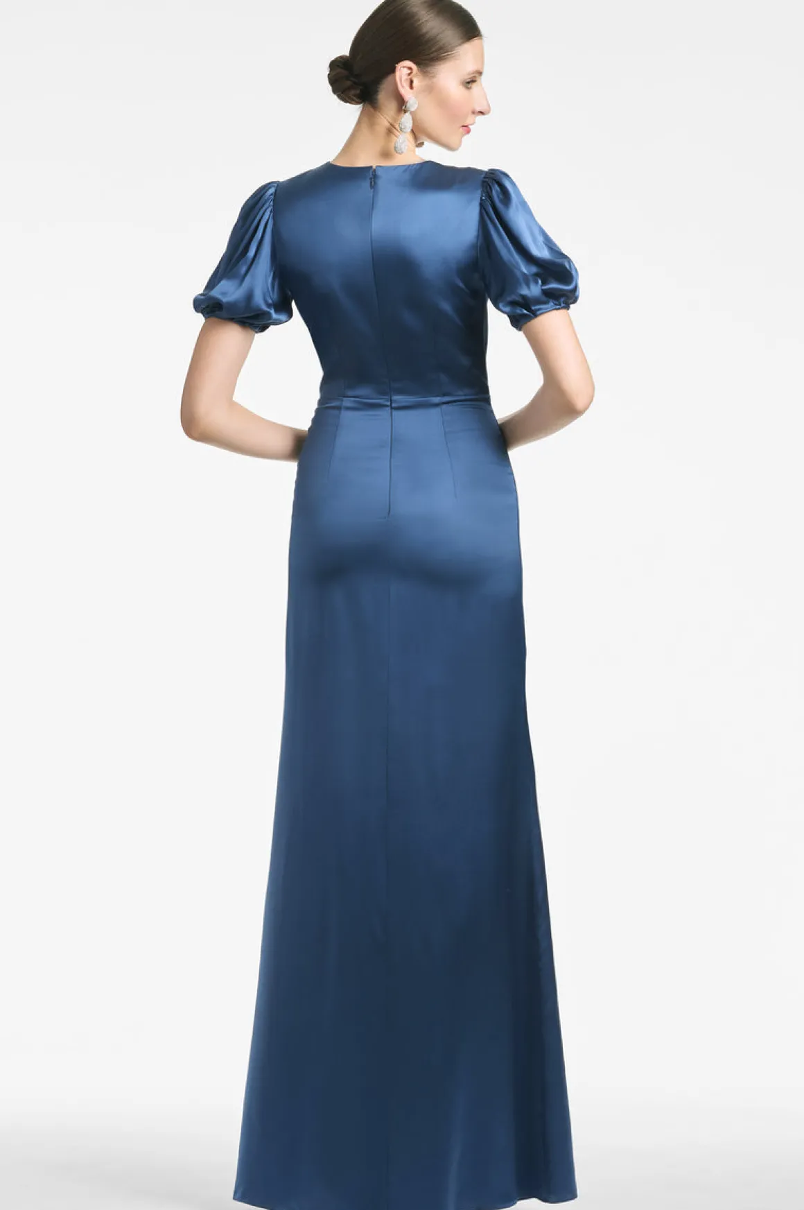 The Mila Gown is an elegant, sleek, example of balance by design. A sleeve of crepe creates a column for curves. At the waist, a cascading ruffle continues to the hem and reveals a slit that goes just above the knee.