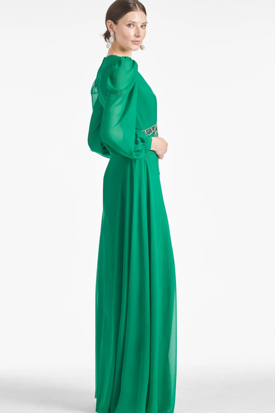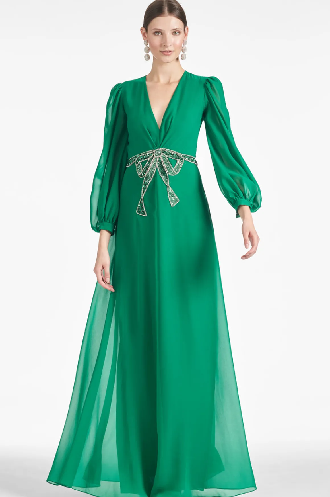 Look radiant in the Ramsey Gown! Featuring a stunning a-line silhouette, this gorgeous malachite green gown has three-quarter sleeves and an embellished bow detail at the waist for a look that is both elegant and eye-catching. Perfect for any mother of the bride or groom, wedding guest or special occasion.